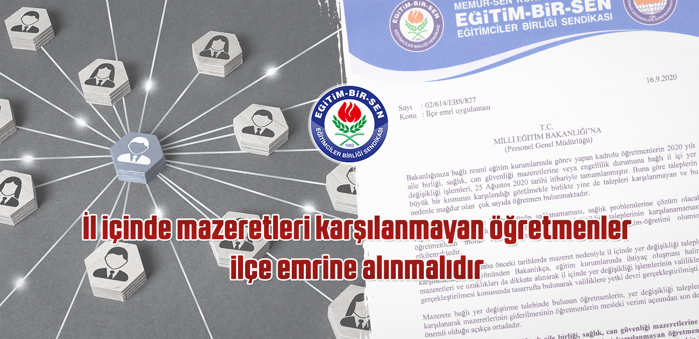 Eğitim-Bir-Sen olarak, Millî Eğitim Bakanlığı’na başvurarak, 2020 yılı mazerete bağlı il içi yer değişikliği talepleri karşılanmayan öğretmenlerin, mazeretlerinin bulunduğu ilçeye doğrudan ulaşım imkânı bulunan il içinde bir başka ilçeye veya mazeretinin bulunduğu ilçeye (50 km gibi) makul bir mesafesi bulunan bir başka ilçeye, ilçe millî eğitim müdürlüğü emrine atamalarının yapılmasını talep ettik.