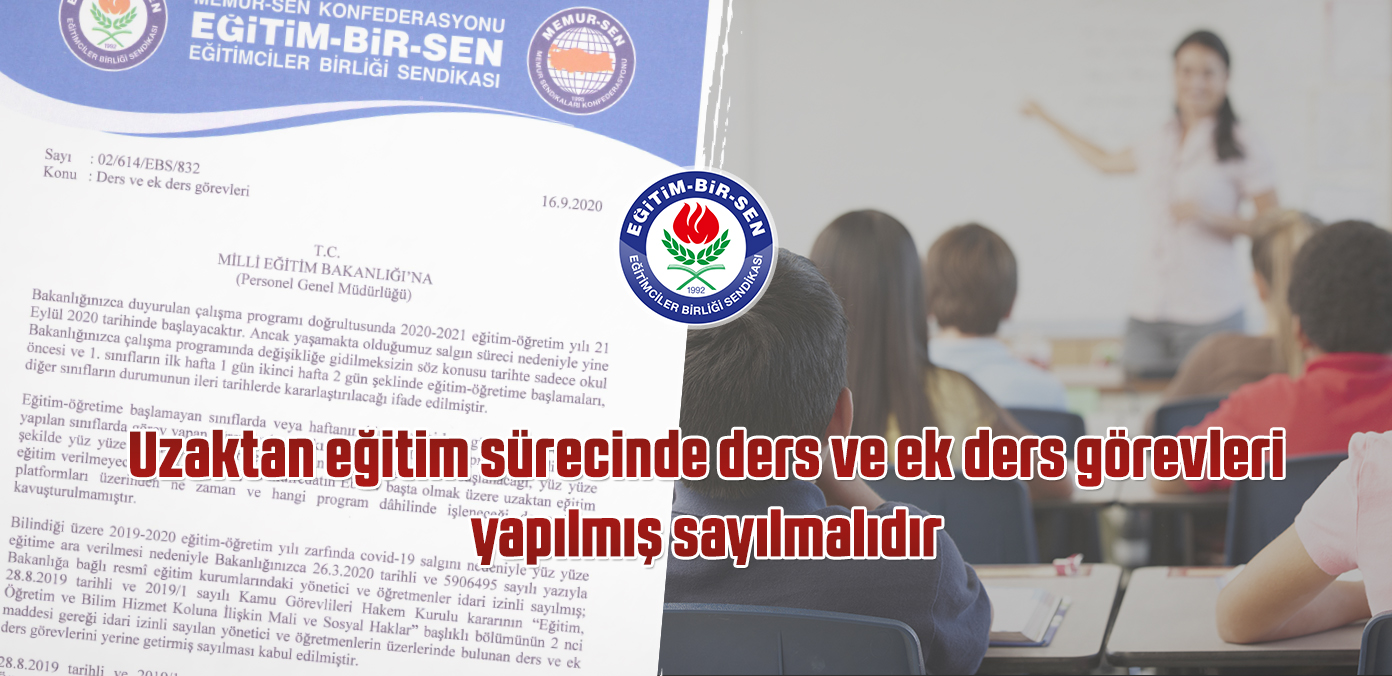 Eğitim-Bir-Sen olarak, Millî Eğitim Bakanlığı’na başvuruda bulunarak, öncelikle fiilen yüz yüze eğitime geçilmesi beklenmeksizin yönetici ve öğretmenlerin ders dağılımlarının yapılarak haftalık ders yüklerinin belirlenmesini, akabinde 21.9.2020 tarihi itibarıyla başlayacak 2020-2021 eğitim-öğretim yılında eğitim-öğretime başlamayan kurumlarda/sınıflarda veya haftanın bir veya birkaç günü eğitim-öğretim yapılan sınıflarda görev yapan yönetici ve öğretmenlerin üzerlerinde bulunan ders ve ek ders görevlerinin yapılmış sayılmasını, buna ilişkin özlük haklarının ödenmesine dair düzenleme yapılmasını talep ettik.
