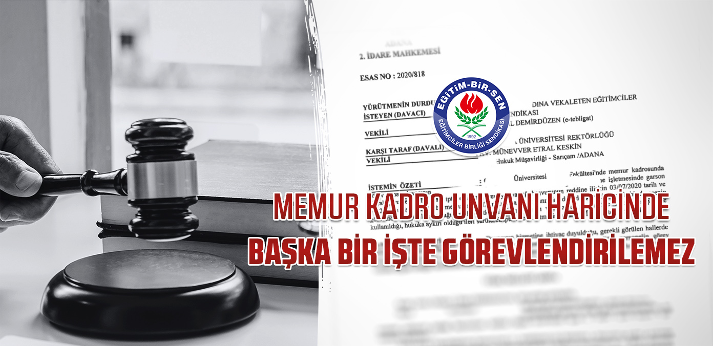 Eğitim-Bir-Sen olarak, memur kadrosunda görev yapan üyemizin, çalıştığı üniversitenin işletmesinde garson olarak görevlendirilmesinin iptali istemiyle açtığımız davada, mahkeme, kurumların, personeli belirli bir sınıf içerisinde çalıştırmaları gerektiği ve bu konuda bağlı yetki içinde oldukları, yine kurumların belli bir sınıf içinde çalışan personele, o sınıfın karşılığı olarak öngörülen görevlerin dışında başka bir görev verme seçeneğinin de bulunmadığı gerekçesiyle yürütmenin durdurulmasına hükmetti.