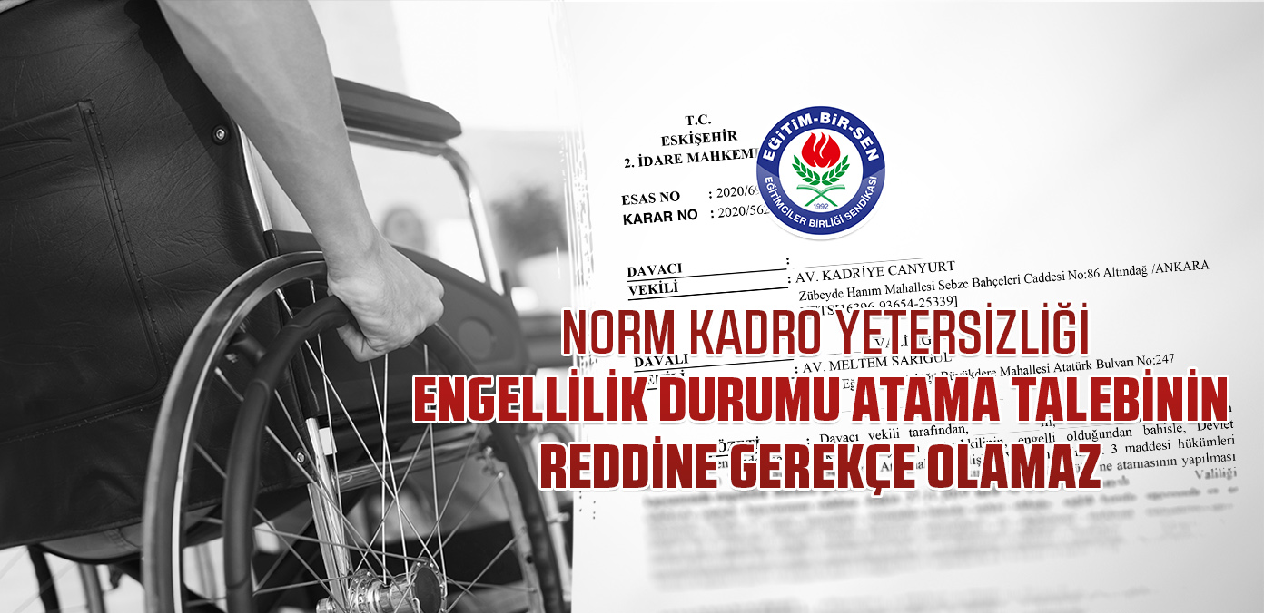 Eğitim-Bir-Sen olarak, ilçe millî eğitim müdürlüğü emrinde şef olarak görev yapan üyemizin, engellilik durumu göz önünde bulundurularak, il millî eğitim müdürlüğüne atamasının yapılması talebiyle yaptığı başvurunun, merkez ve merkez ilçelerde şef kadrosunda norm olmadığı gerekçesiyle reddedilmesi işleminin iptali için açtığımız davada, mahkeme, dava konusu işlemi sebep ve amaç unsurları yönünden hukuka aykırı buldu.
