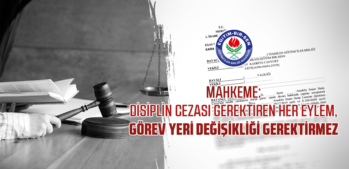 Eğitim-Bir-Sen olarak, imam hatip lisesinde müdür yardımcısı olarak görev yapan üyemizin soruşturma neticesinde hakkındaki iddiaların sübut bulduğu gerekçesiyle başka bir okula öğretmen olarak atanması işleminin iptali için açtığımız davada, mahkeme, disiplin cezası gerektiren her eylemin görev yeri değişikliğini gerektirmediği gibi, görev yeri değişikliği gerektiren her eylemin de disiplin cezasını gerektirmeyebileceğine dikkat çekerek, üyemizin görev yaptığı yerde kalmasını engelleyici mahiyette bir eyleminin olmaması nedeniyle, dava konusu atama işlemini iptal etti.