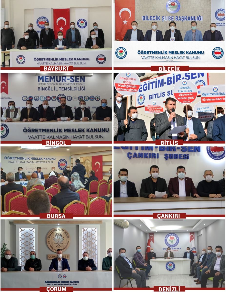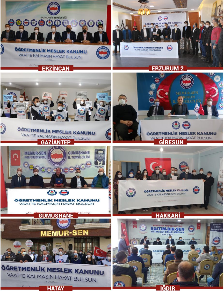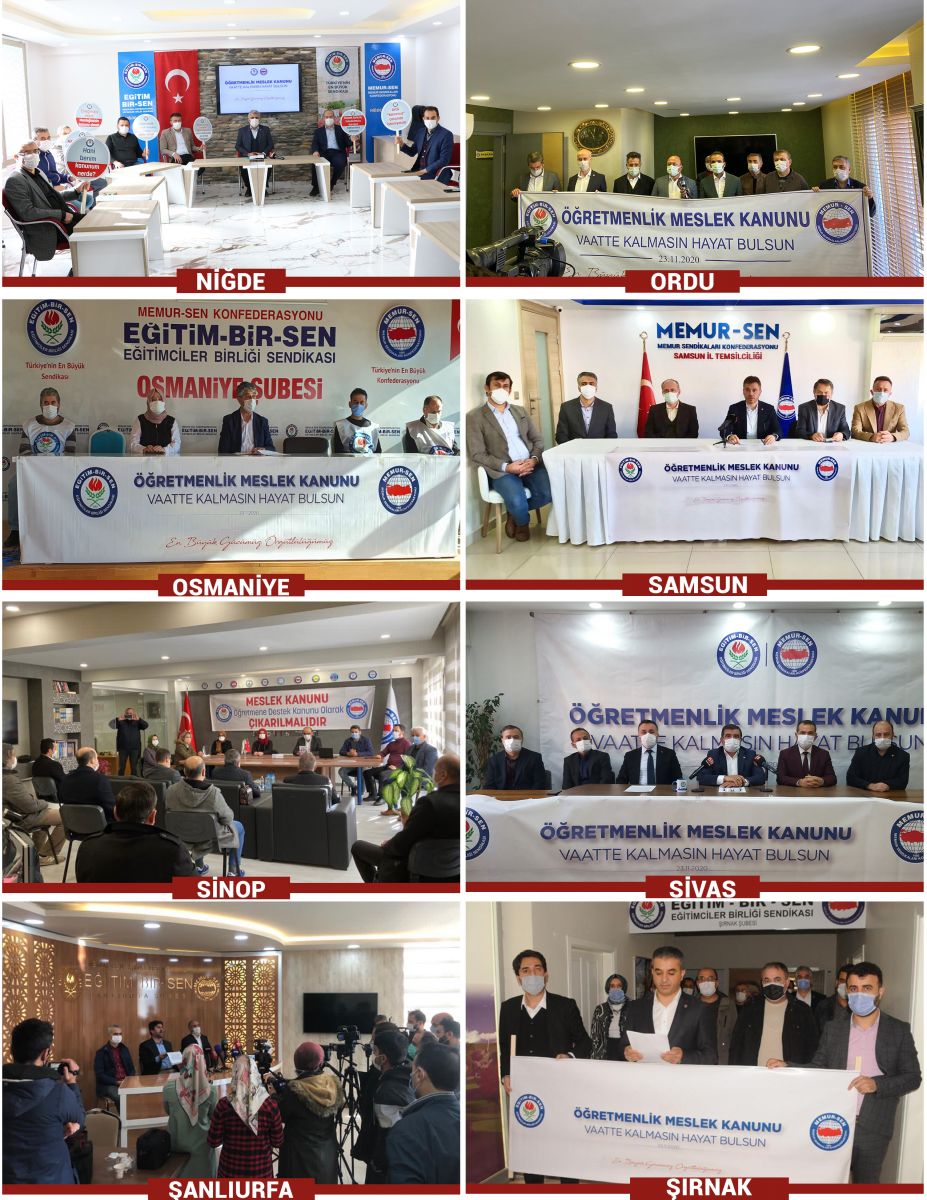 24 Kasım Öğretmenler Günü dolayısıyla eğitim çalışanlarının sorunlarına dikkat çekmek ve öğretmenlerin meslek kanunu talebini dile getirmek amacıyla 81 ilde basın açıklaması yaparak, meslek kanununun ‘öğretmenlerin statüsünü, toplumsal itibarını yükseltebilecek, haklarda kazanç sağlayacak, çalışma şartlarını iyileştirecek, şiddeti de önleyecek’ türden bir içerikle uygulamaya konulması çağrısında bulunduk.
