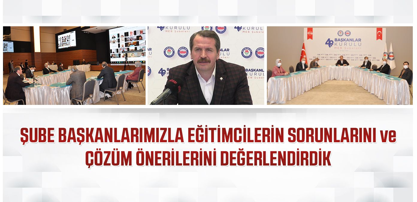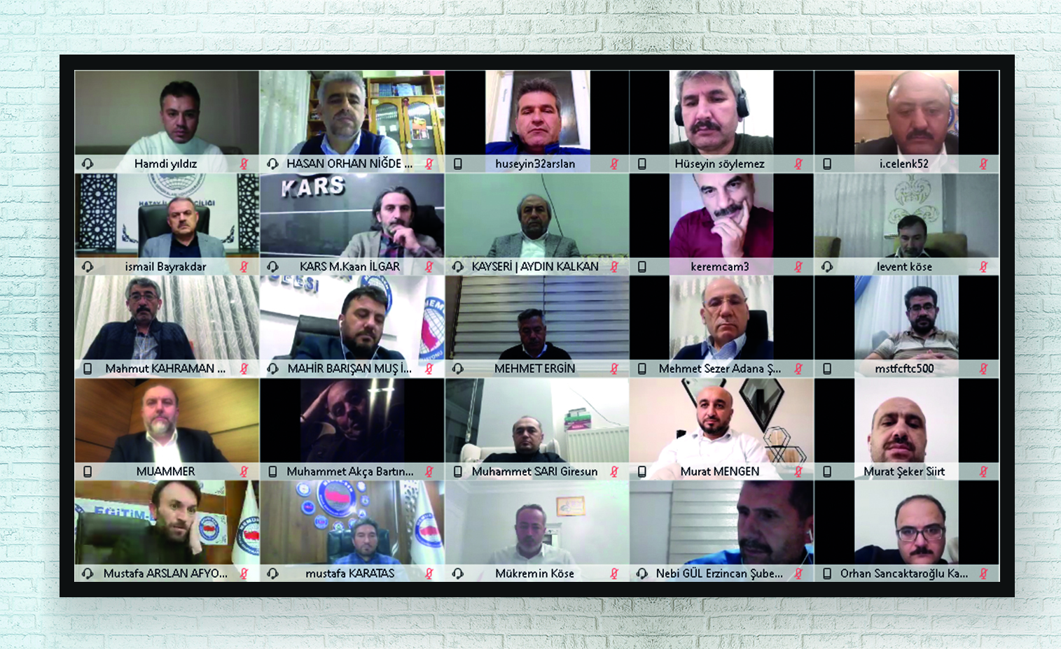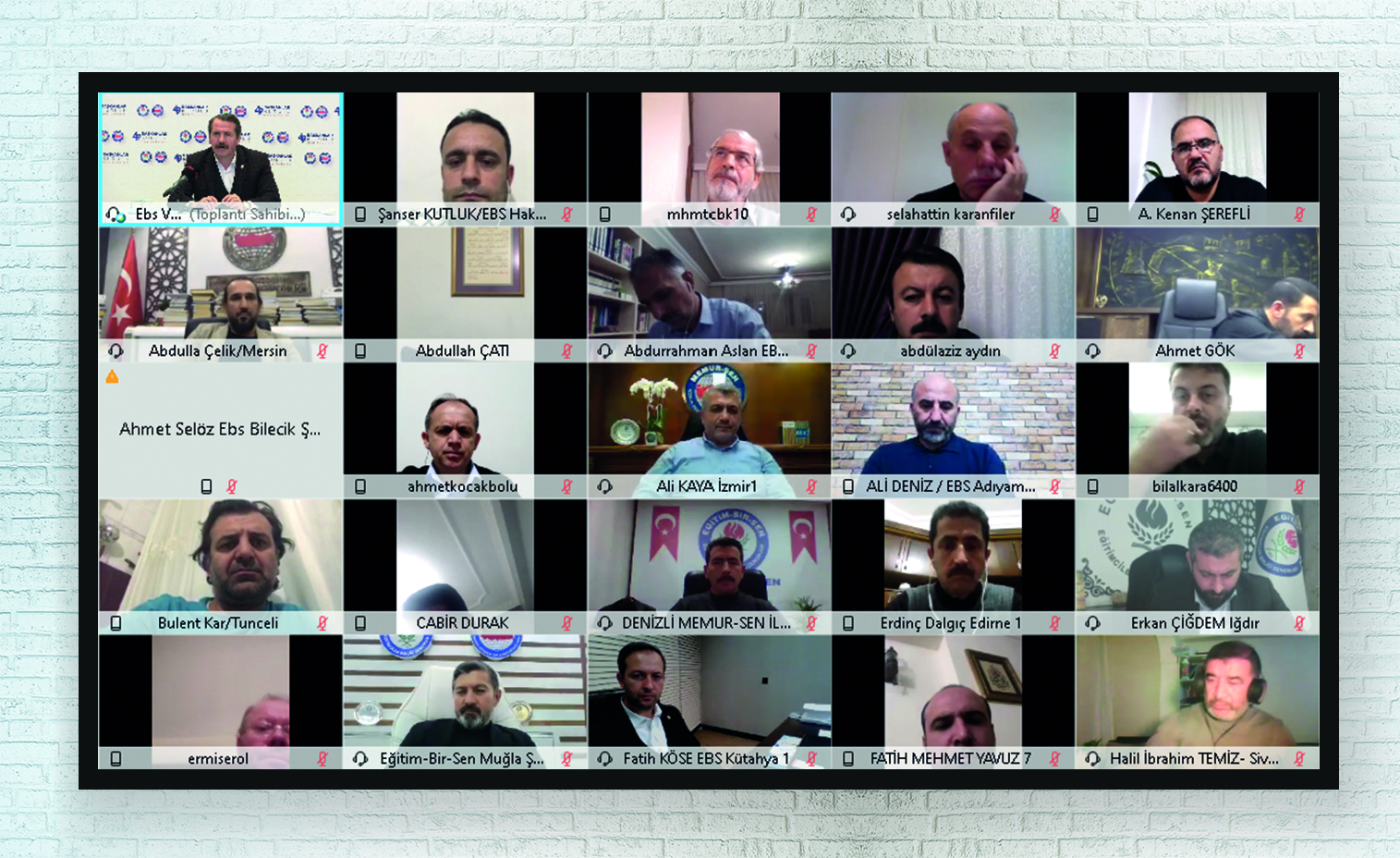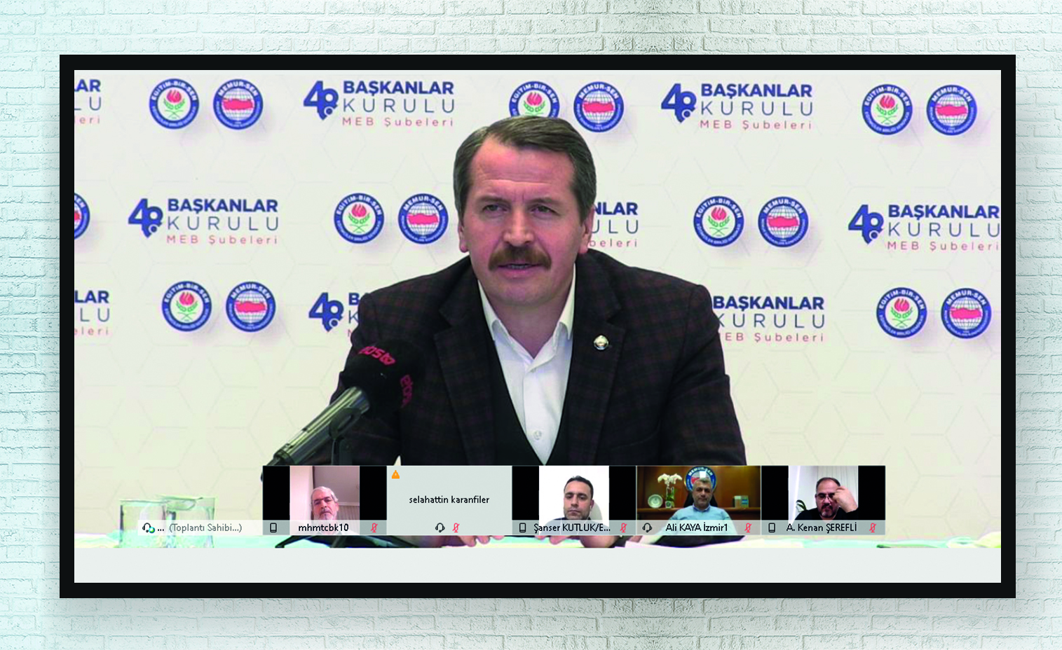 Eğitim-Bir-Sen (Millî Eğitim Şubeleri) Başkanlar Kurulu Toplantısı video konferans yöntemiyle yapıldı. Uzaktan eğitim ve süreç yönetimi, uzaktan eğitime erişim sorunları, salgının eğitim kurumlarına, çalışanlara yaşattığı sıkıntıların görüşüldüğü toplantının açılışında konuşan Ali Yalçın, “Alandan, sahadaki uygulayıcılardan, teşkilatlarımızdan aldığımız, bize iletilen sorunların çözümü için Bakanlık yetkilileriyle gereken görüşmeleri yaptık. Uzaktan eğitim sürecinde ücretli öğretmenlerin, usta öğreticilerin mağduriyetinin önüne geçilmesi, mazeret tayini, öğretmenlerin iller arası yer değişikliği hakkı, atamaları yapıldığı hâlde kararnamesi gönderilmeyen öğretmenlerin göreve başlatılmaları için sendika olarak üzerimize düşeni yerine getirdik. Böylece eğitim çalışanlarının hak kaybına uğramasının önüne geçtik” ifadelerini kullandı.