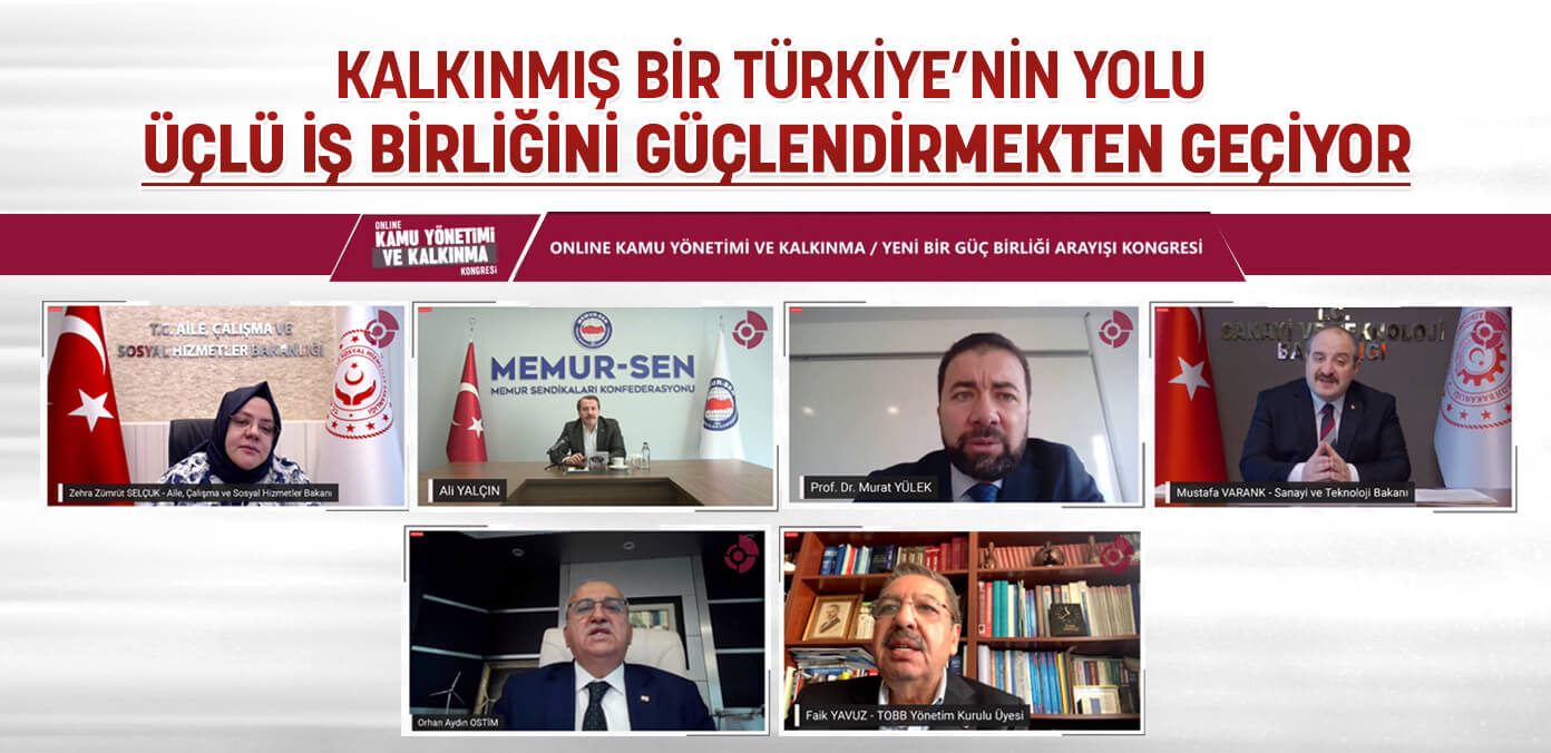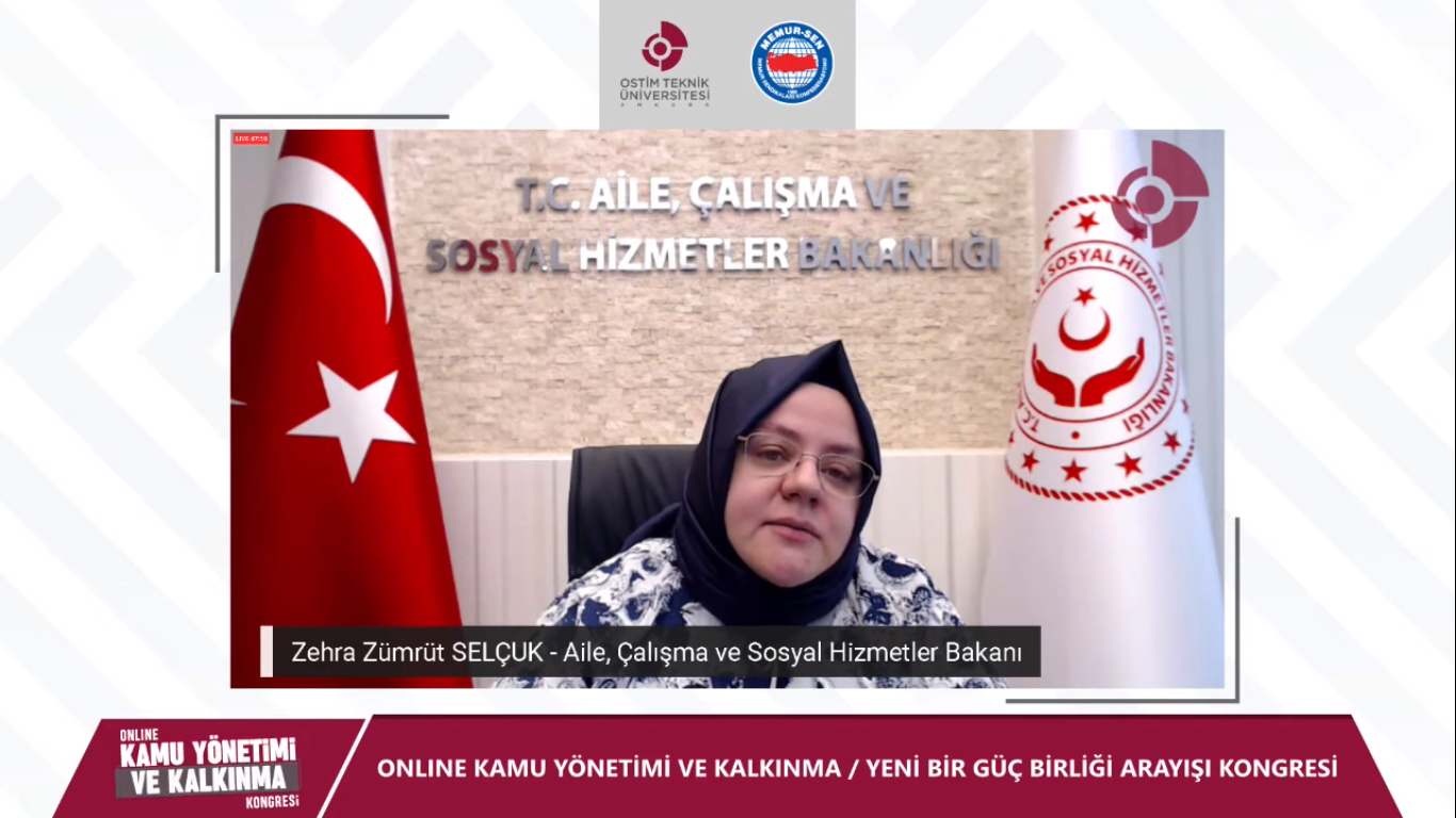 Video konferans yöntemiyle yapılan ve kalkınmanın üç temel ayağı olan kamu, özel sektör ve akademi arasındaki iş birliğinin bugününün ve yarınının ele alındığı kongrenin açılış oturumunda bir konuşma yapan Aile, Çalışma ve Sosyal Hizmetler Bakanı Zehra Zümrüt Selçuk, kalkınma yolunda güçlü iş birliğinin önemini gösteren bir kongreyi düzenledikleri için Memur-Sen ve OSTİM Teknik Üniversitesi’ne teşekkür ederek, “Daha güçlü bir Türkiye için daha çok çalışmak, daha çok istihdam yaratmak ve daha çok üretmek gerekmektedir. Ekonomik kalkınmanın tek başına yeterli olmadığını bugün biliyoruz. Ekonomik kalkınma ancak sosyal kalkınma eşlik ederse, insani gelişme onunla entegre bir şekilde büyürse bir anlamı oluyor. BM raporları da bize bunu söylüyor. Ülkemizde de çok yönlü kalkınma perspektifi ile her alanda gelişmişlik seviyemizi 18 yıl boyunca artırdık” ifadelerini kullandı.