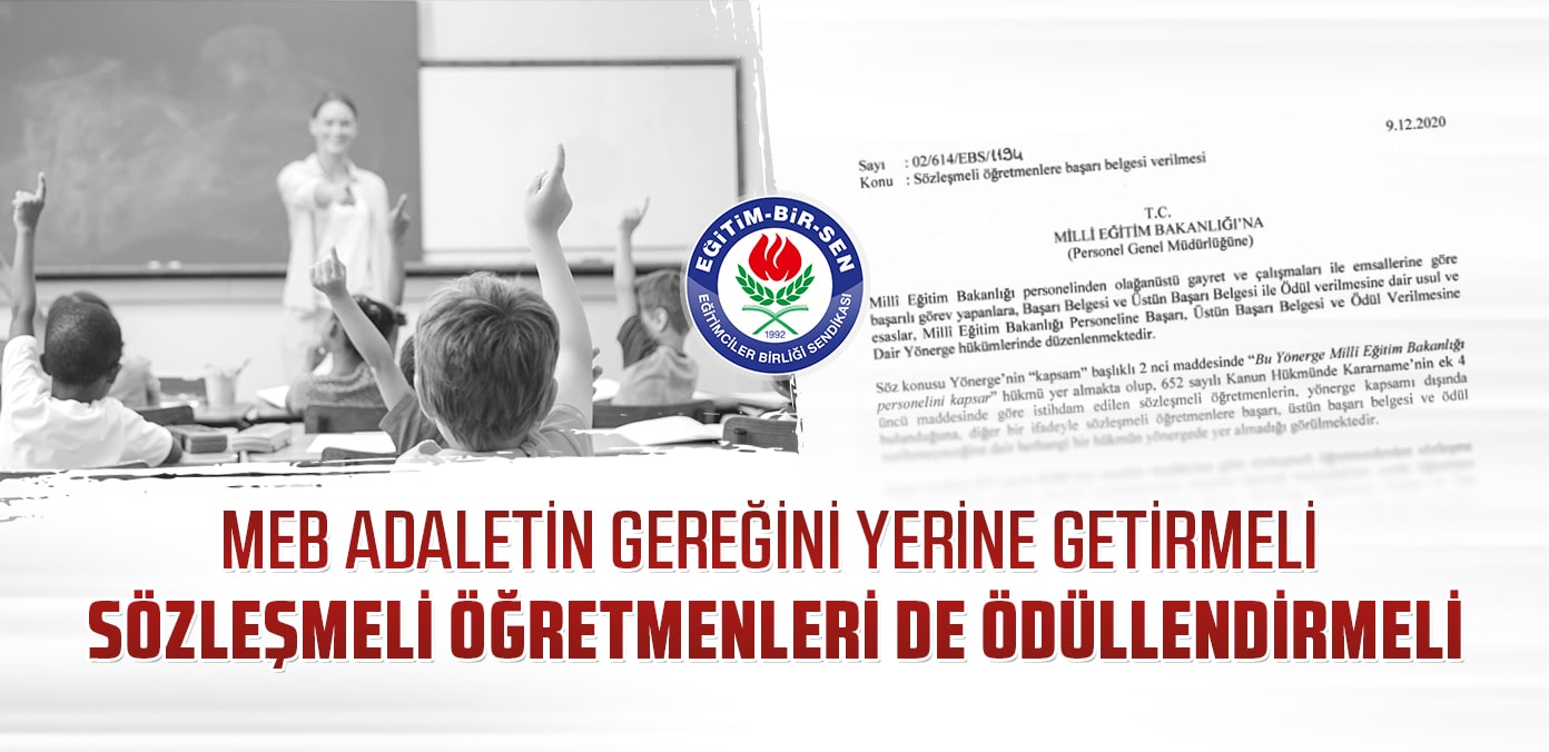 Eğitim-Bir-Sen olarak Millî Eğitim Bakanlığı’na başvuru yaparak, sözleşmeli öğretmenlere Millî Eğitim Bakanlığı Personeline Başarı, Üstün Başarı Belgesi ve Ödül Verilmesine Dair Yönerge hükümleri çerçevesinde başarı, üstün başarı belgesi ve ödül verilebileceğine dair genel bir görüş yazısının taşra teşkilatına gönderilmesini talep ettik.