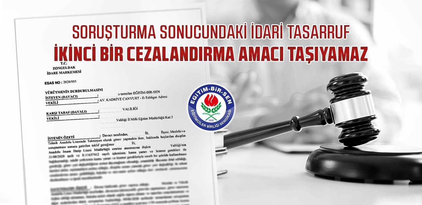 Söz konusu işlemin yürütmesini durduran Zonguldak İdare Mahkemesi, kararında, “Dava dosyasındaki bilgi ve belgeler ile soruşturma dosyasının birlikte incelenmesinden; davacı hakkında başlatılan soruşturma sonucu 1/30 oranında aylıktan kesme disiplin cezası ile tecziye edilmesine karar verilmesi yanında soruşturma raporundaki öneri üzerine davacının atanmasının başka bir okula yapıldığı, söz konusu atama işleminin, aynı eylemden dolayı davacının ikinci defa cezalandırılması anlamına geleceği, zira isnat edilen eylemler davacının naklen atanmasını gerektirecek nitelikte ve ağırlıkta olmadığı, davacının, görev yaptığı kuruluşun huzur ve sükûnunu bozucu ya da düzenli ve verimli hizmet sunumunu sekteye uğratacak ve bulunduğu yerden başka bir hizmet birimine atanmayı gerektirebilecek tutum ve davranışları bulunduğuna ilişkin somut bir tespitin de ortaya konulamadığı anlaşıldığından, tesis edilen dava konusu işlemde hukuka uyarlık bulunmadığı sonuç ve kanaatine varılmıştır” ifadelerine yer verdi.