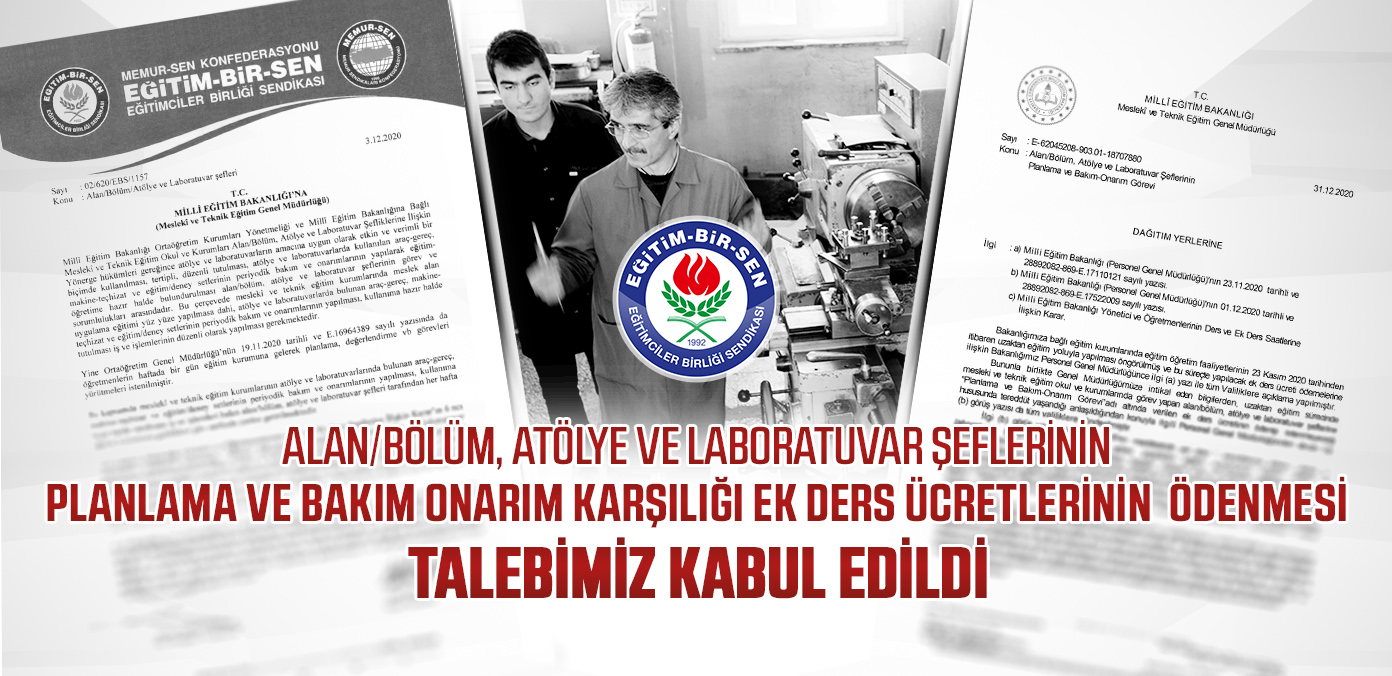 3.12.2020 tarihinde Bakanlığa yazılı başvuruda bulunarak, Millî Eğitim Bakanlığı Ortaöğretim Kurumları Yönetmeliği ve Millî Eğitim Bakanlığına Bağlı Meslekî ve Teknik Eğitim Okul ve Kurumları Alan/Bölüm, Atölye ve Laboratuvar Şefliklerine İlişkin Yönerge hükümleri gereğince, meslekî ve teknik eğitim kurumlarında meslek alan uygulama eğitimi yüz yüze yapılmasa dahi, atölye ve laboratuvarlarda bulunan araç-gereç, makine-teçhizat ve eğitim/deney setlerinin periyodik bakım ve onarımlarının yapılması, kullanıma hazır hâlde tutulması iş ve işlemlerinin düzenli olarak yapılması gerekliliği ve bu görevin fiilen yürütülmekte olduğundan bahisle alan/bölüm, atölye ve laboratuvar şeflerine “planlama ve bakım-onarım görevi” karşılığı ek ders ücreti ödenmesi konusunda genel bir yazının Bakanlık teşkilatına gönderilmesini talep etmiştik.