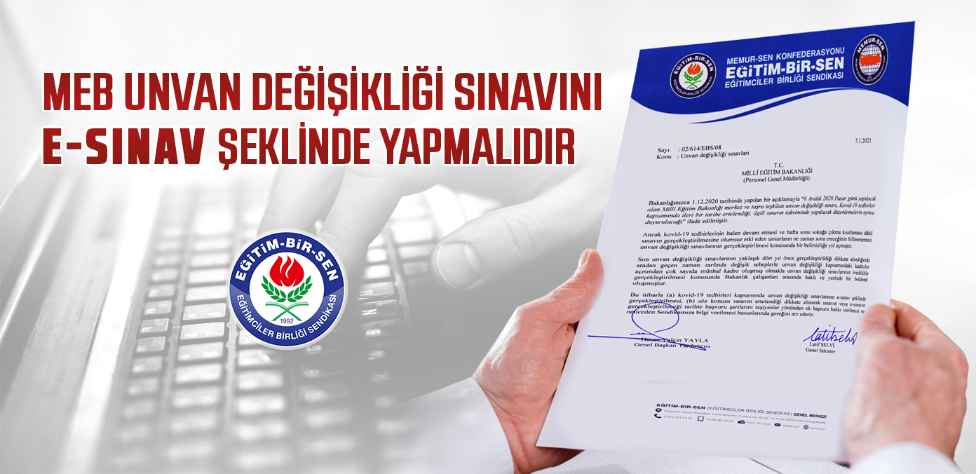 Eğitim-Bir-Sen olarak, Millî Eğitim Bakanlığı’na başvuruda bulunarak, kovid-19 tedbirleri kapsamında ertelenen unvan değişikliği sınavının e-sınav şeklinde gerçekleştirilmesini ve söz konusu sınavın veya e-sınavın yapılacağı tarihte başvuru şartlarını taşıyanlara ek başvuru hakkı verilmesini talep ettik.