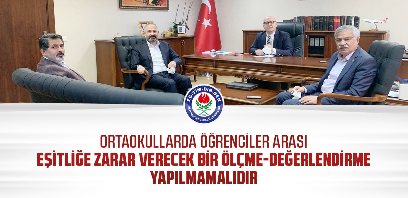 Eğitim-Bir-Sen Genel Sekreteri Latif Selvi, Genel Başkan Yardımcısı Şükrü Kolukısa ve Hasan Yalçın Yayla ile birlikte, Millî Eğitim Bakanlığı Temel Eğitim Genel Müdürü Dr. Cem Gençoğlu ile bir görüşme yaparak, 2020-2021 eğitim-öğretim yılı birinci dönemi için ortaokullarda yapılacak ölçme-değerlendirme faaliyetlerinin objektif kriterlere uygun, öğrencilerin üst öğrenimlerini olumsuz etkilemeyecek ve eşitsizlik oluşturmayacak şekilde düzenlenmesi talebinde bulundu.
