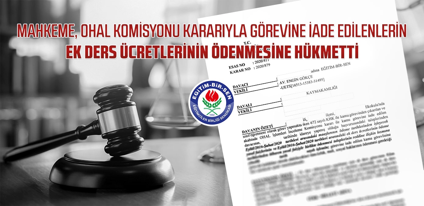 Eğitim-Bir-Sen olarak, Kanun Hükmünde Kararname ile kamu görevinden çıkarılan ve sonrasında OHAL Komisyonu kararıyla görevine iade edilen üyemizin ek ders ücretlerinin ödenmesi talebinin reddine ilişkin işlemin iptali için açtığımız davada, mahkeme, dava konusu işlem olmasaydı, fiilen çalışma şartını yerine getireceğinden, üyemizin görevde olmadığı döneme ilişkin tüm ek ders ücretlerinin yasal faiziyle birlikte ödenmesi gerektiğine karar verdi.