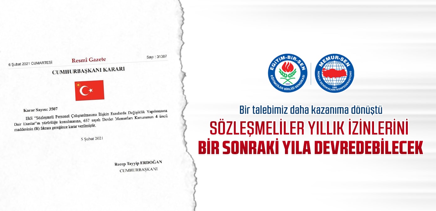 Memur-Sen’in Toplu Sözleşme’de pazarlık masasına getirdiği, KPDK toplantılarında gündeme taşıdığı, “Sözleşmeliliğe Son Şurası”nda inceleme başlığı olarak ele aldığı farklı sempozyum, kongre ve panellerde de dile getirdiği son olarak da Aile, Çalışma ve Sosyal Hizmetler Bakanı Sayın Zehra Zümrüt Selçuk ile AK Parti Grup Başkanvekili Sayın Mehmet Muş’a iletilen ve sunumu yapılan sözleşmelilerle ilgili raporda yer verdiği “Sözleşmelilerin yıllık izinlerinin devir hakkı mahrumiyeti” konusu, “Sözleşmeli Personel Çalıştırılmasına İlişkin Esaslarda Değişiklik Yapılmasına Dair Esaslar konulu 3507 sayılı Cumhurbaşkanı Kararı ile söz konusu esasların 2. Maddesinde yer verilen düzenleme ile sona ermiş oldu. Böylece 4/B Statüsündeki sözleşmeli personel, yıl içerisinde kullanılmayan yıllık izin sürelerini kadrolu kamu görevlilerinde olduğu gibi bir sonraki yıla devredip kullanabilecek. Bir başka ifadeyle sözleşmeli personel 4/A statüsündeki kamu görevlileri gibi cari yıl ile önceki yılın iznini birleştirebilecek.