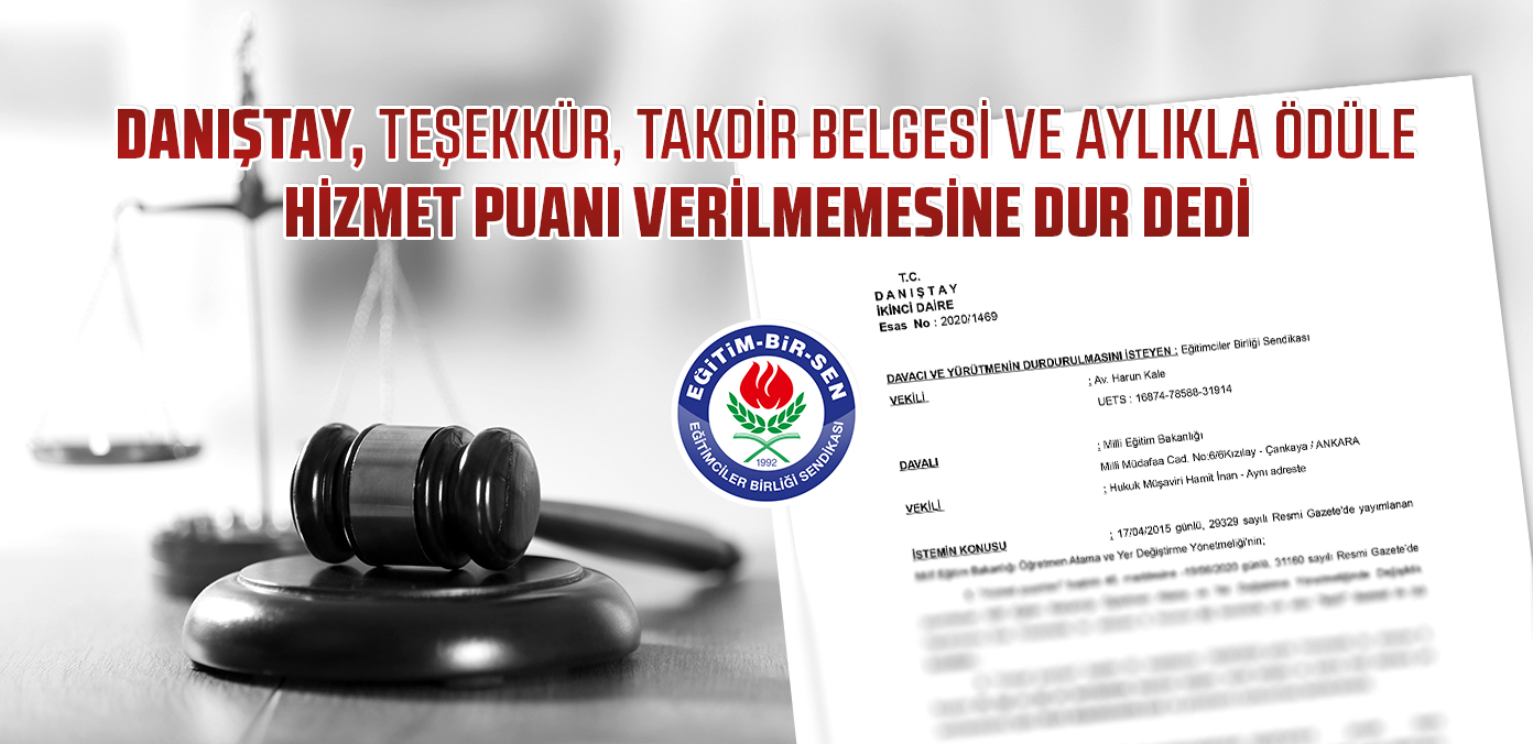 Eğitim-Bir-Sen olarak, Haziran 2020 tarihinde Öğretmen Atama ve Yer Değiştirme Yönetmeliği’nde yapılan değişiklikle başarı, üstün başarı belgesi ve ödüle puan verilmesine rağmen teşekkür, takdir belgesi ve aylıkla ödüle puan verilmemesine ilişkin eksik düzenleme nedeniyle açtığımız davada, Danıştay, yürütmenin durdurulmasına hükmetti.