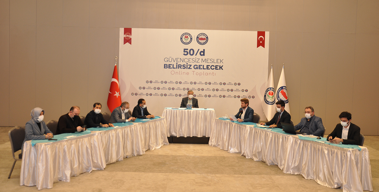 Eğitim-Bir-Sen Genel Sekreteri Latif Selvi, 50/d kapsamında görev yapan araştırma görevlileriyle video konferans yöntemiyle bir araya gelerek, alandaki sıkıntılara, beklentilere ve çözüm önerilerine ilişkin istişarelerde bulundu.
