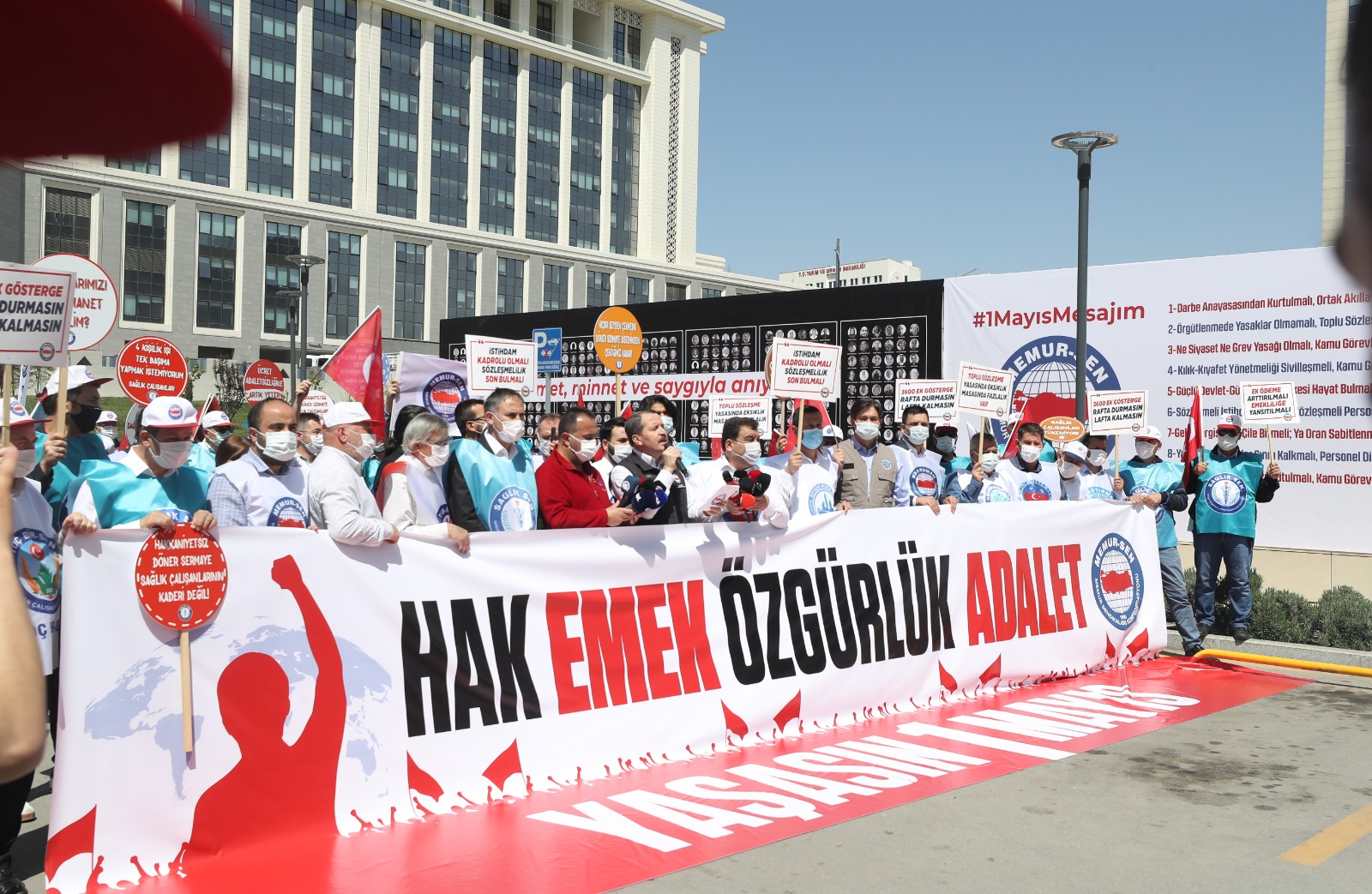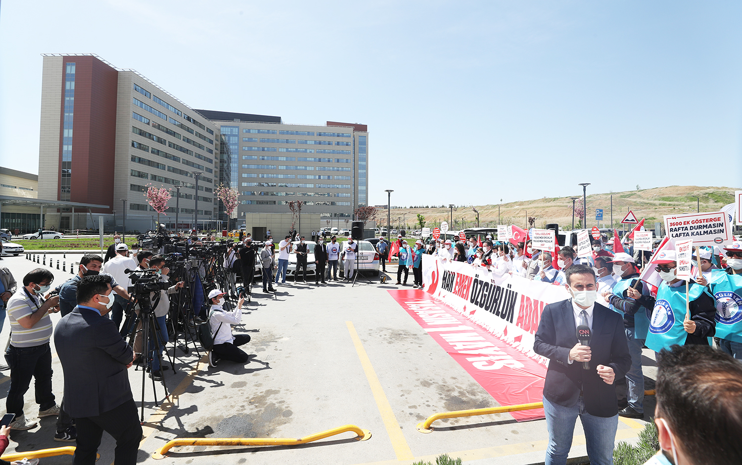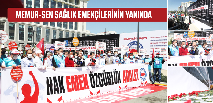 Memur-Sen, 1 Mayıs bildirisini pandemiyle en ön safta mücadele veren sağlık çalışanlarına destek olmak amacıyla Ankara Şehir Hastanesi’nin bahçesinde okudu.