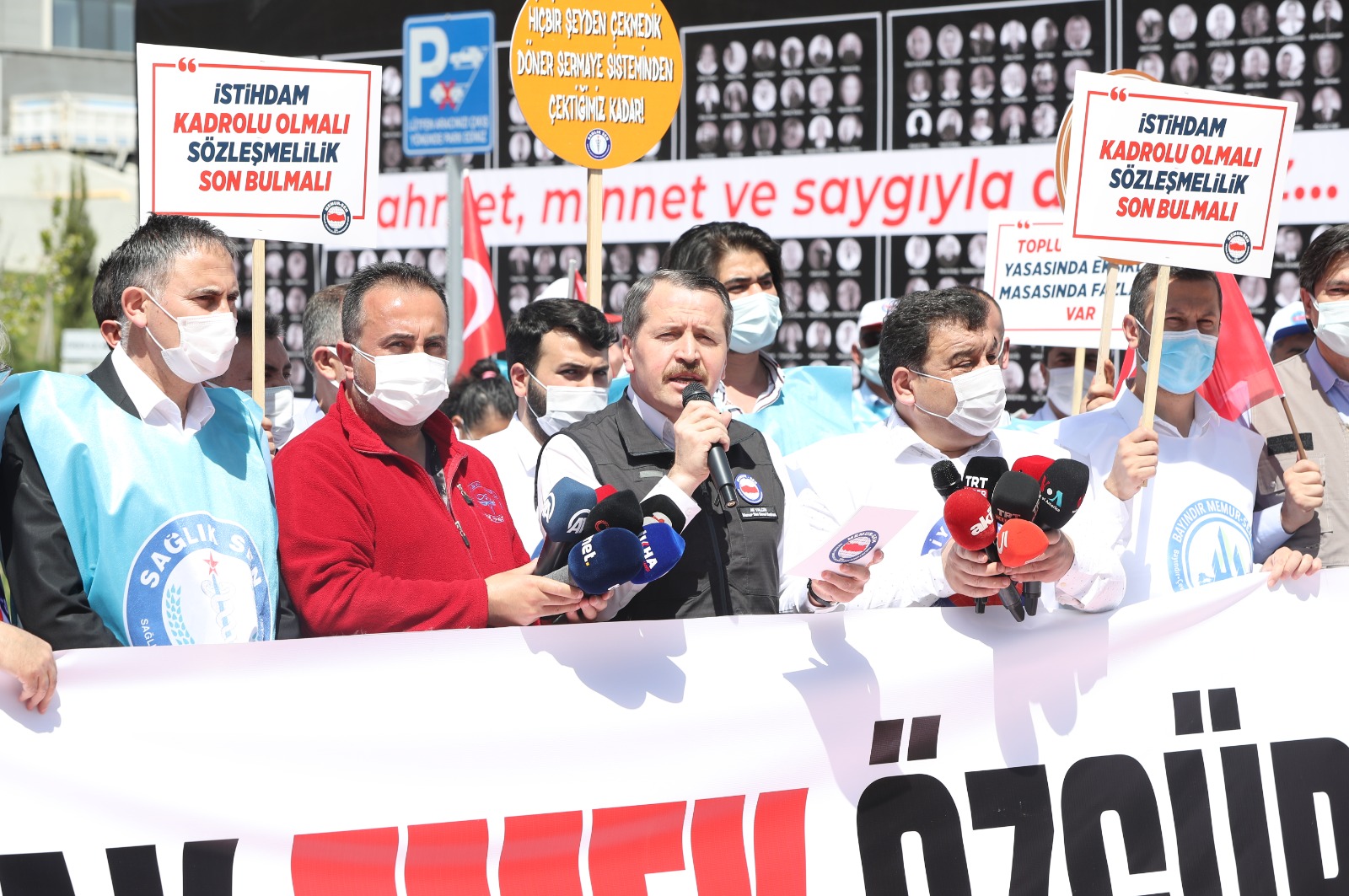 Genel Başkan Ali Yalçın, "Türkiye'de hala sözleşmeli sağlık emekçisi yanlışı var. Bütün kamuda olduğu gibi sağlıkta da sözleşmelilik bitmeli. Sağlık alanında personel eksikliği giderilmeli, iş yükü hafifletilmeli" dedi. Konfederasyonun 1 Mayıs bildirisini okuyan Genel Başkan Yalçın, bu yıl 1 Mayıs'ı virüse direnen ve salgınla mücadelede en önde yürüyen sağlık emekçilerine ithaf ettiklerini belirtti.