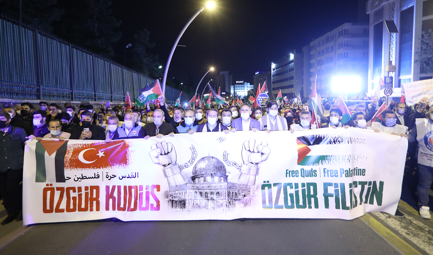 Memur-Sen Konfederasyonu, Siyonist İsrail’in Mescid-i Aksa’yı işgal girişimini 81 ilde protesto etti. Ankara’daki eylemde, Memur-Sen ve sivil toplum kuruluşları, TBMM önünden İsrail Büyükelçiliği’ne yürüyerek terörist devlet İsrail’i kınadı. İsrail Büyükelçiliği önünde açıklama yapan Eğitim-Bir-Sen ve Memur-Sen Genel Başkanı Ali Yalçın, “Mescid-i Aksa özgürleşmeden insanlık özgürleşemez. ‘Komşusu açken tok yatan bizden değil’ iken, komşusu zulüm altında iken hiçbir şey yokmuş gibi yatan bizden olabilir mi? Mescid-i Aksa’da huzur yokken gözüne uyku giren, bizden değildir. İşgale tepki vermeyen, bizden değildir. Vahşete son vermek için söz söylemeyen, bizden değildir. Mescid-i Aksa’dan Siyonist barbarları defetmek için ter dökmeyen, bizden değildir. Siyonist İsrail’i durdurmaya söz veriyor muyuz? Filistin’i işgalden kurtarmaya söz veriyor muyuz? Filistinli kardeşlerimizi öldüren terörist İsrail’e had bildirmeye ses istiyoruz. Kudüs’ün onuruna sahip çıkmaya, Siyonun yıldızını söküp atmaya söz istiyoruz. Irkçı Yahudi zorbaları Mescid-i Aksa’dan çıkarmaya ant istiyoruz” dedi.