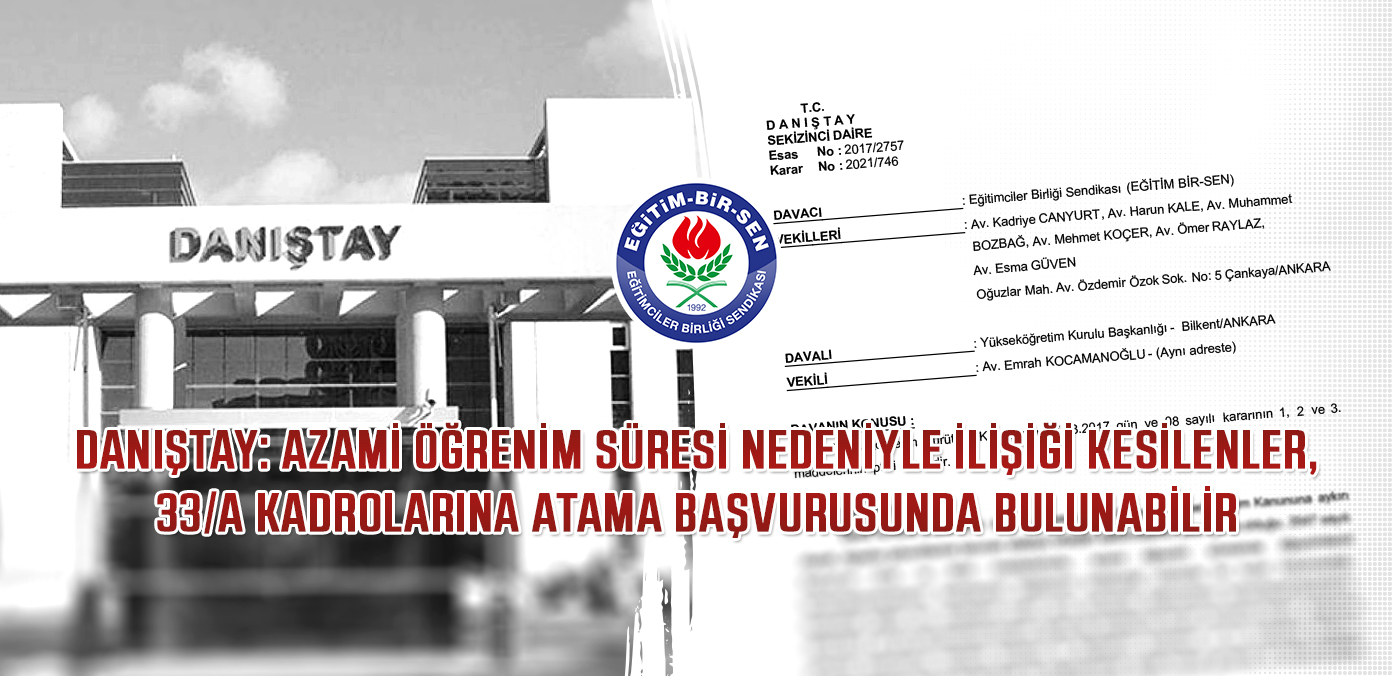 Eğitim-Bir-Sen olarak, YÖK Yürütme Kurulu’nun 2017 tarihinde aldığı azami öğrenim süresini dolduran ancak 2016-2017 güz yarıyılından sonra tekrar başlayanların veya azami öğrenim sürelerinin dolması nedeniyle kadroyla ilişikleri kesilenlerin 2547 sayılı Kanun’un 33/a maddesi uyarınca ilan edilen araştırma görevlisi kadro ilanlarına başvuramamalarına ilişkin karara karşı açtığımız davada, Danıştay iptal kararı verdi.