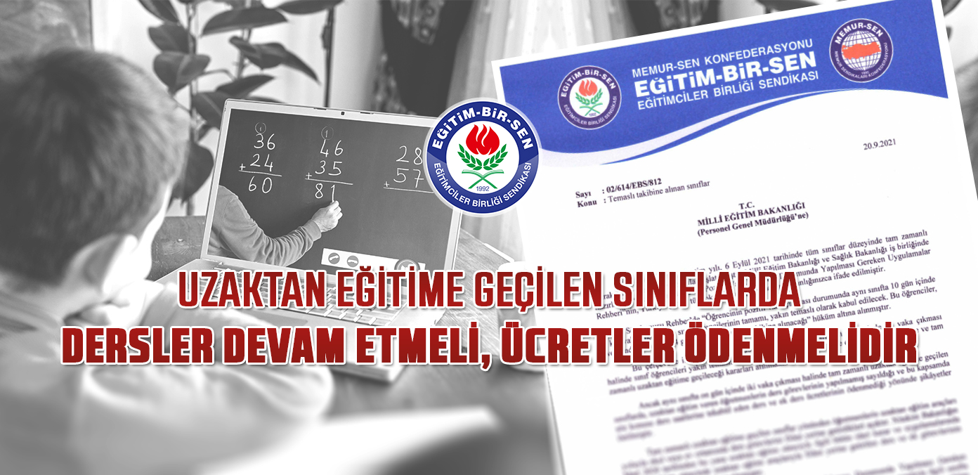Eğitim-Bir-Sen olarak, Millî Eğitim Bakanlığı’na başvurarak, Okullarda Covid-19 Pozitif Vaka Çıkması Durumunda Yapılması Gereken Uygulamalar Rehberi çerçevesinde aynı sınıfta on gün içinde iki vaka çıkması suretiyle ilgili sınıfta yüz yüze eğitime ara verilerek tam zamanlı uzaktan eğitime geçilen hâllerde, uzaktan eğitim araçlarıyla eğitim-öğretim görevlerini fiilen yerine getiren öğretmenlerin, söz konusu ders ve ek ders görevlerinin fiilen yapılmış sayılarak ders ve ek ders ücretlerinden herhangi bir kesinti yapılmamasını talep ettik.