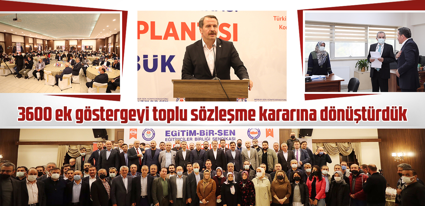 Eğitim-Bir-Sen ve Memur-Sen Genel Başkanı Ali Yalçın, 3600 ek gösterge ve sözleşmeli istihdamı, ‘toplu sözleşmenin konusu değil’den toplu sözleşmenin kararına dönüştürdüklerini belirterek, “3600’ü, ek göstergelerin yeniden düzenlenmesi konusunu yetkili konfederasyon olarak her toplu sözleşmede masaya taşıdık. Israrımız sonucu, ek gösterge konusu ‘masayı aşar’dan ‘masa bunu da kapsar’a döndü” dedi.