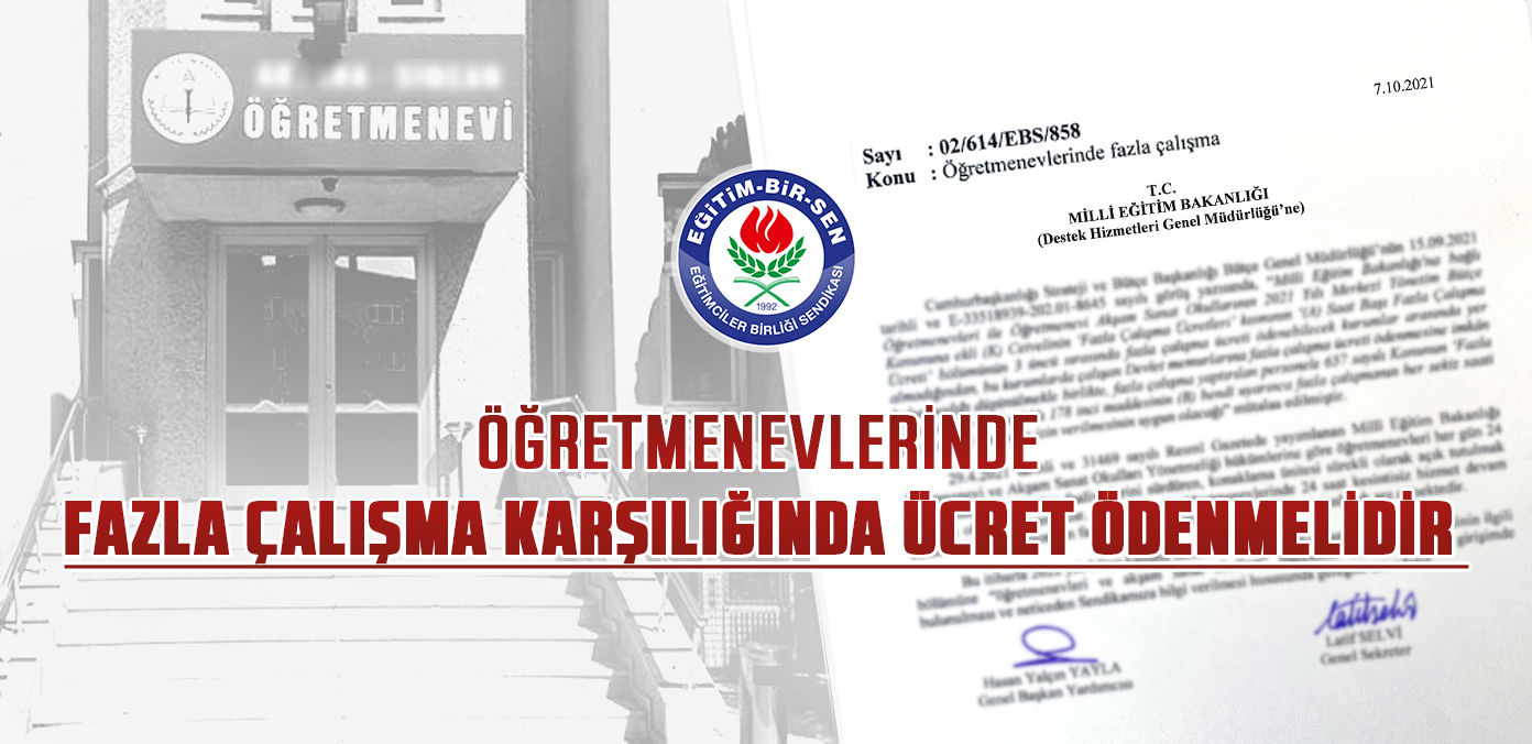 Eğitim-Bir-Sen olarak, Millî Eğitim Bakanlığı’na başvurarak, 24 saat kesintisiz hizmet veren öğretmenevlerinde fazla çalışma karşılığı ücret ödenebilmesini teminen 2022 yılı bütçe kanunu hazırlık sürecinde bütçe kanunu eki (K) cetvelinin ilgili bölümüne “öğretmenevleri ve akşam sanat okulları” ibaresinin eklenmesini talep ettik.