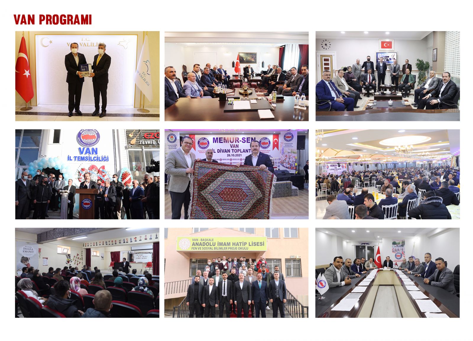 Genel Başkan Ali Yalçın, programı kapsamında Hakkâri Valisi İdris Akbıyık’ı, İl Millî Eğitim Müdürü Bilal Gür’ü, Hakkâri Üniversitesi Rektörü Prof. Dr. Ömer Pakiş’i, Van Valisi Mehmet Emin Bilmez’i, Van Yüzüncü Yıl Üniversitesi Rektörü Prof. Dr. Hamdullah Şevli’yi, İl Millî Eğitim Müdürü Hasan Tevke’yi, Başkale’deki Anadolu İmam Hatip Lisesi’nde görev yapan eğitim çalışanlarını ziyaret etti.
