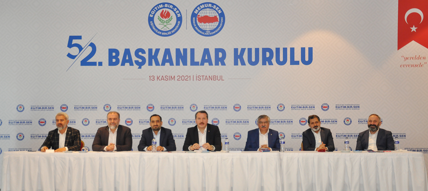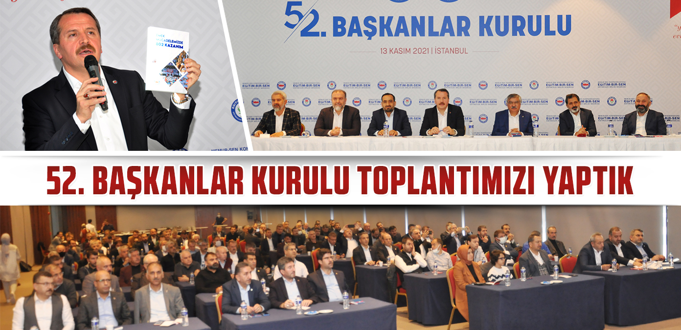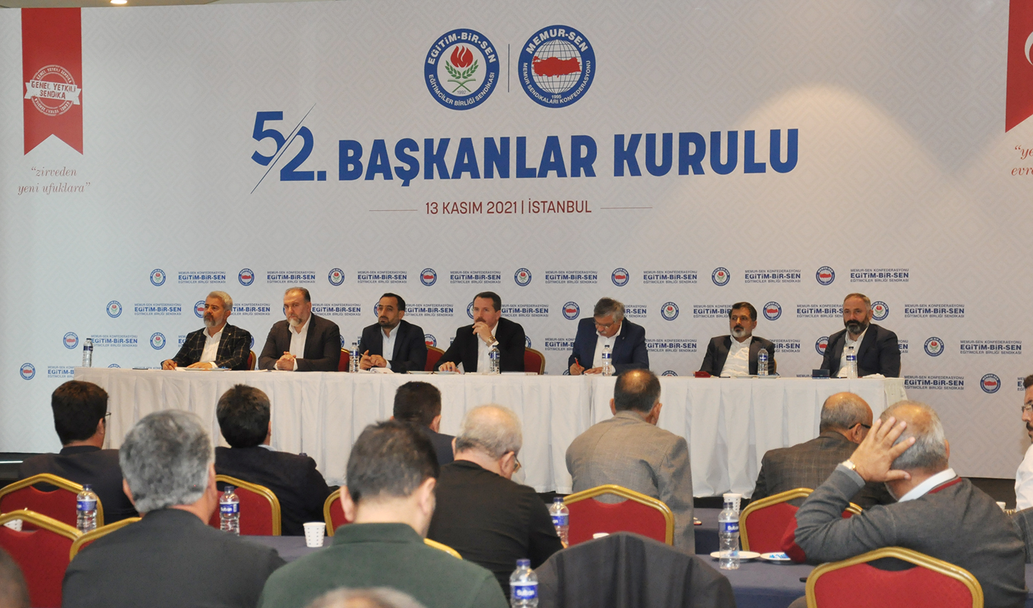 Eğitim-Bir-Sen 52. Başkanlar Kurulu toplantısı İstanbul’da gerçekleştirildi. Toplu sözleşme sürecinin, sendikal çalışmaların, eğitimin, eğitim çalışanlarının sorunlarının ve 20. Millî Eğitim Şûrası gündemine taşınacak önerilerin değerlendirildiği toplantının açılışında konuşan Eğitim-Bir-Sen ve Memur-Sen Genel Başkanı Ali Yalçın, 6. Dönem Toplu Sözleşme’de sorunlara çözüm bulunması, yeni kazanımların elde edilmesi konusunda ellerinden geleni yaptıklarını, eğitim çalışanlarının beklentilerinin karşılık bulması için var güçleriyle mücadele ettiklerini söyledi.