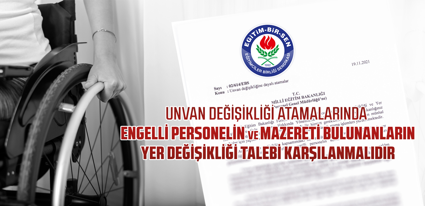 Eğitim-Bir-Sen olarak, Millî Eğitim Bakanlığı’na başvurarak, unvan değişikliği sınav sonuçlarına dayalı atama sürecinde mazerete bağlı yer değişikliği talebi bulunanların mazeretlerinin bulunduğu yere; engelli personelin ise istemeleri hâlinde bulundukları yerlere atamalarının gerçekleştirilmesini talep ettik.