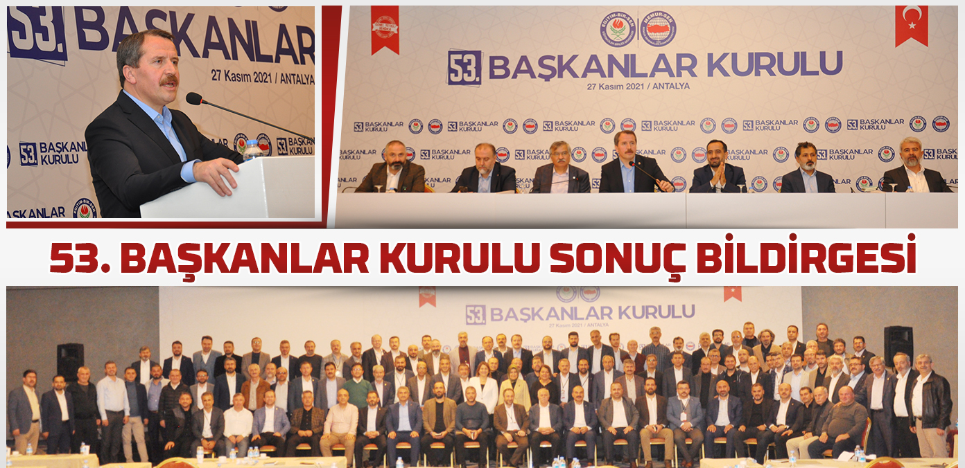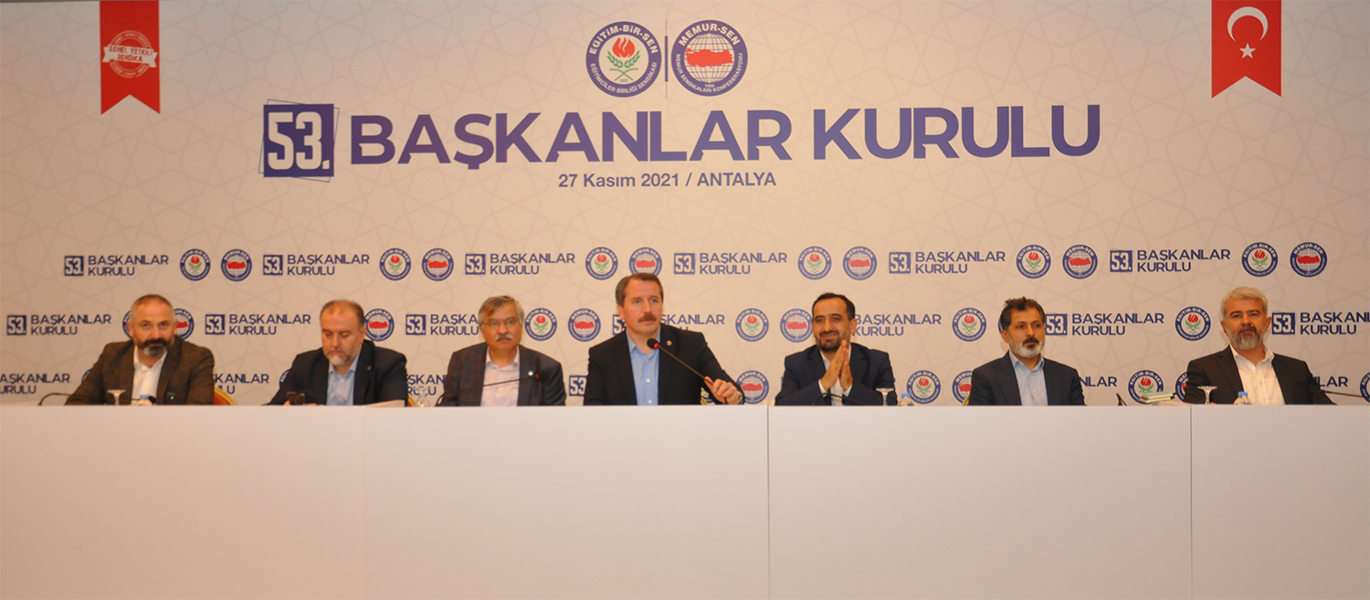 Eğitim-Bir-Sen 53. Başkanlar Kurulu Toplantısı Antalya’da yapıldı. Sendikal çalışmaların, eğitim çalışanlarının sorunlarının ve çözüm önerilerinin görüşüldüğü, istişarelerin yapıldığı toplantıda, acil çözüm bekleyen meselelere dikkat çekilerek, yetkililere çözüme ilişkin adım atılması çağrısında bulunuldu.