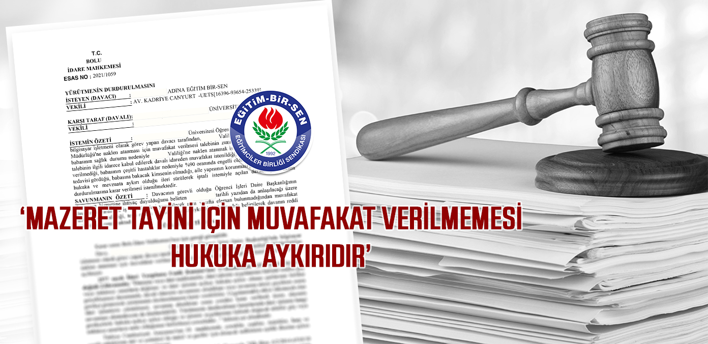 Eğitim-Bir-Sen olarak, babasının sağlık mazereti nedeniyle naklen atanma talebine muvafakat verilmeyen üyemiz adına açtığımız davada, mahkeme, engelli memurlar ile ağır engelli ağır engel raporlu eşi veya bakmakla yükümlü olduğu birinci derece kan hısımları bulunan memurların taleplerinin yer değiştirme yönetmeliğinde yer alan kısıtlayıcı hükümlere tabi olmaksızın “kadro imkânları ve hizmet ihtiyacı” dikkate alınarak değerlendirilmesinin idare açısından bir yükümlülük olduğuna hükmederek, işlemin yürütmesini durdurdu.