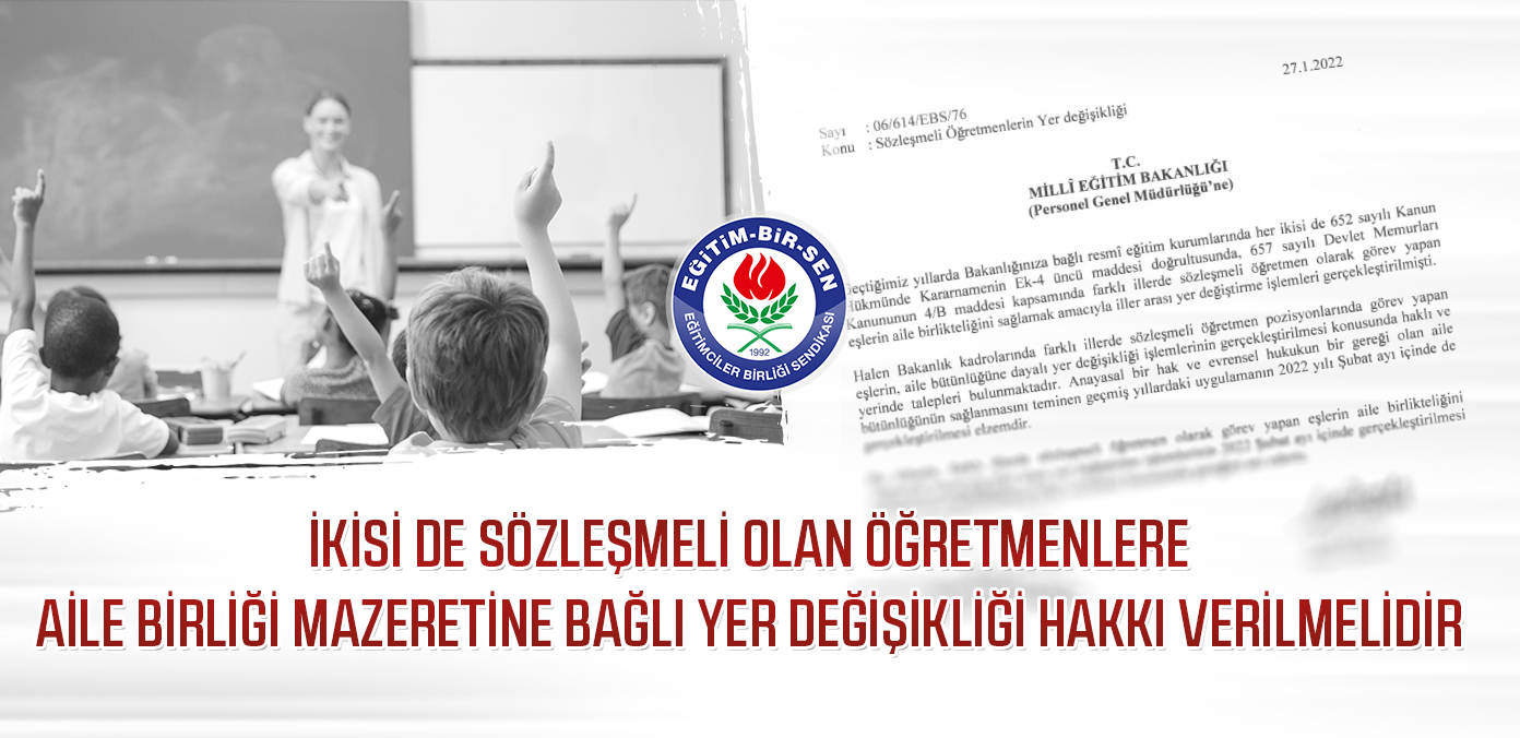 Eğitim-Bir-Sen olarak, Millî Eğitim Bakanlığı’na başvurarak, farklı illerde sözleşmeli öğretmen olarak görev yapan eşlerin aile birlikteliğini sağlamak amacıyla iller arası yer değiştirme işlemlerinin 2022 Şubat ayı içinde gerçekleştirilmesini talep ettik.