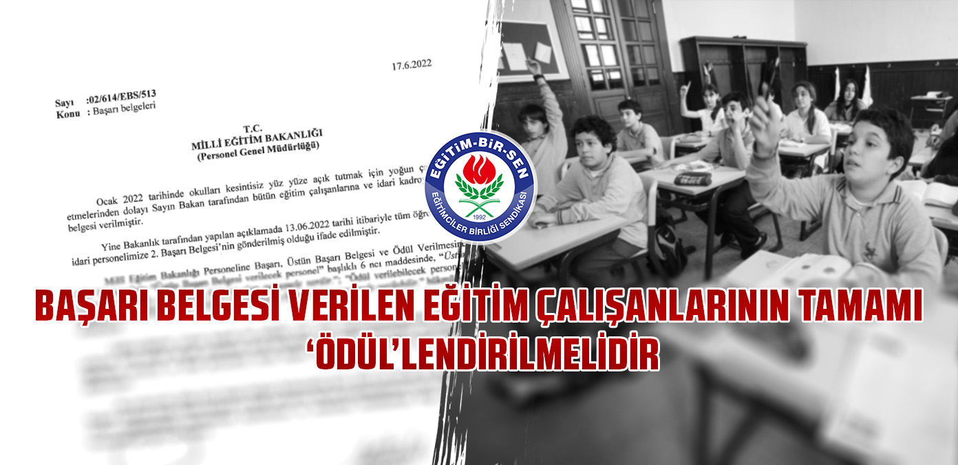 Eğitim-Bir-Sen olarak, Millî Eğitim Bakanlığı’na başvurarak, daha önce başarı belgesi bulunmakta iken, 2022 yılı içinde de iki defa başarı belgesi alanlara üstün başarı belgesi ve ödül verilmesini, bunun uygulanabilmesi için de Yönerge’nin 12. maddesindeki sınırlamanın kaldırılmasını talep ettik.