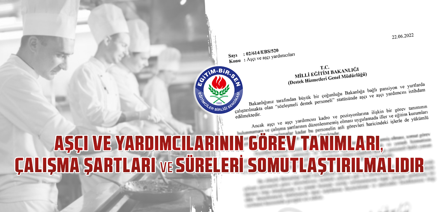 Eğitim-Bir-Sen olarak, Millî Eğitim Bakanlığı’na müracaat ederek, Bakanlığa bağlı kurumlarda aşçı ve aşçı yardımcısı kadro ve pozisyonlarındaki personelin görev tanımlarının, haftalık çalışma gün ve sürelerinin, pansiyon ve yurtlarda öğrenci olup olmamasına ve yemek hizmeti verilip verilmemesine bağlı çalışma şartlarının bir idari düzenlemeyle belirlenerek taşra teşkilatına duyurulmasını talep ettik.