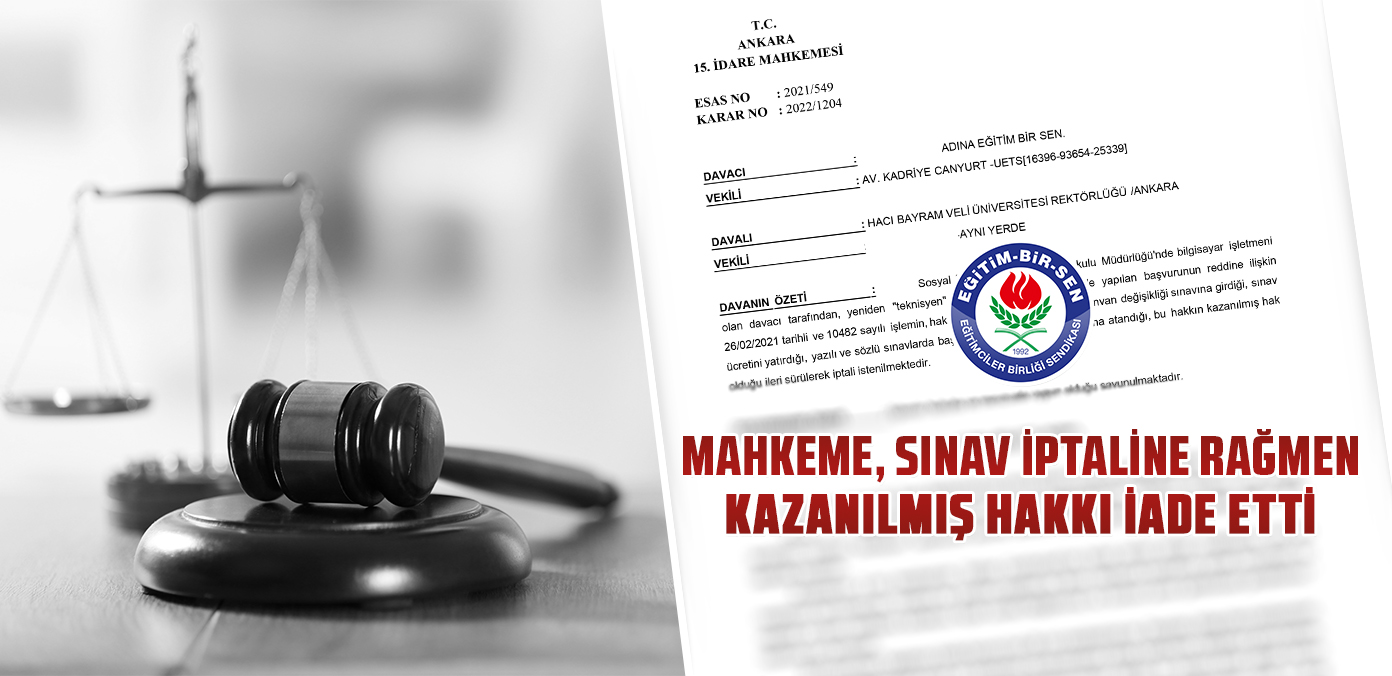 Eğitim-Bir-Sen olarak, sınav ücreti gerekçe gösterilerek bir sendikanın açtığı dava üzerine unvan değişikliği sınavının iptali sonrasında sınava dayalı olarak teknisyen unvanını alan üyemizin yer değiştirdiği kurumca unvanının geri alınarak eski kadrosuna atanması işlemine karşı açtığımız davada, mahkeme, kazanılmış hak ilkesine vurgu yaparak idari istikrar, hukuki güvenlik, belirlilik ve öngörülebilirlik ilkeleri yönünden hukuka ve hakkaniyete uyarlık bulunmadığına hükmetti.