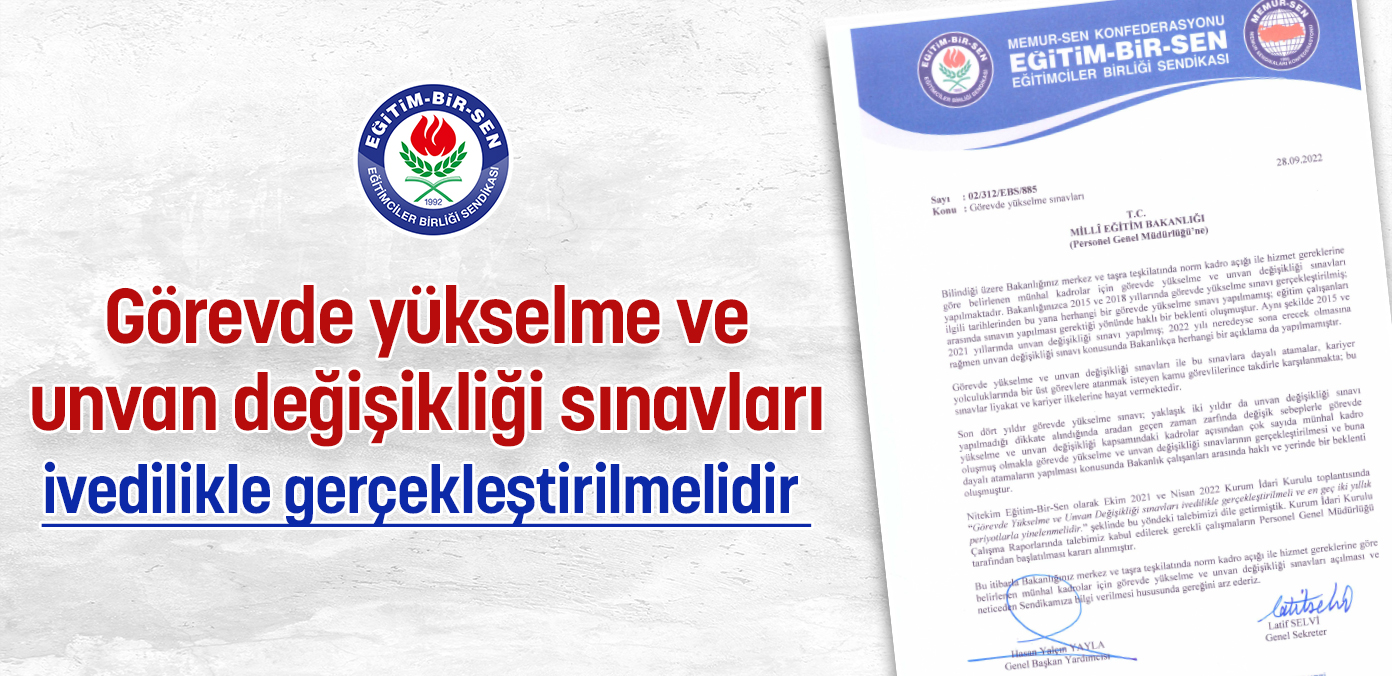 Eğitim-Bir-Sen olarak, Ekim 2021 ve Nisan 2022 Kurum İdari Kurulu toplantılarında, “Görevde Yükselme ve Unvan Değişikliği sınavları ivedilikle gerçekleştirilmeli ve en geç iki yıllık periyotlarla yinelenmesi” yönündeki talebimizi dile getirmiştik. Kurum İdari Kurulu Çalışma raporlarında talebimiz kabul edilerek, gerekli çalışmaların Personel Genel Müdürlüğü tarafından başlatılması kararı alınmıştır.