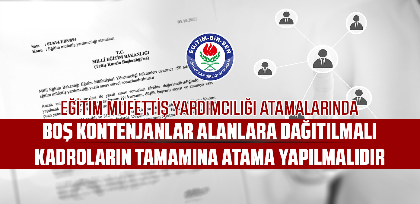 Eğitim-Bir-Sen olarak, Millî Eğitim Bakanlığı’na müracaatta bulunarak, düşük başvuru sayısı ve atamaya esas puan yetersizliği nedeniyle boş kalan alana tahsisli eğitim müfettiş yardımcılığı kadro sayılarının diğer alanlara orantılı bir şekilde dağıtılmasını ve 750 eğitim müfettişliği kadrosunun tamamı için atama yapılmasını talep ettik.