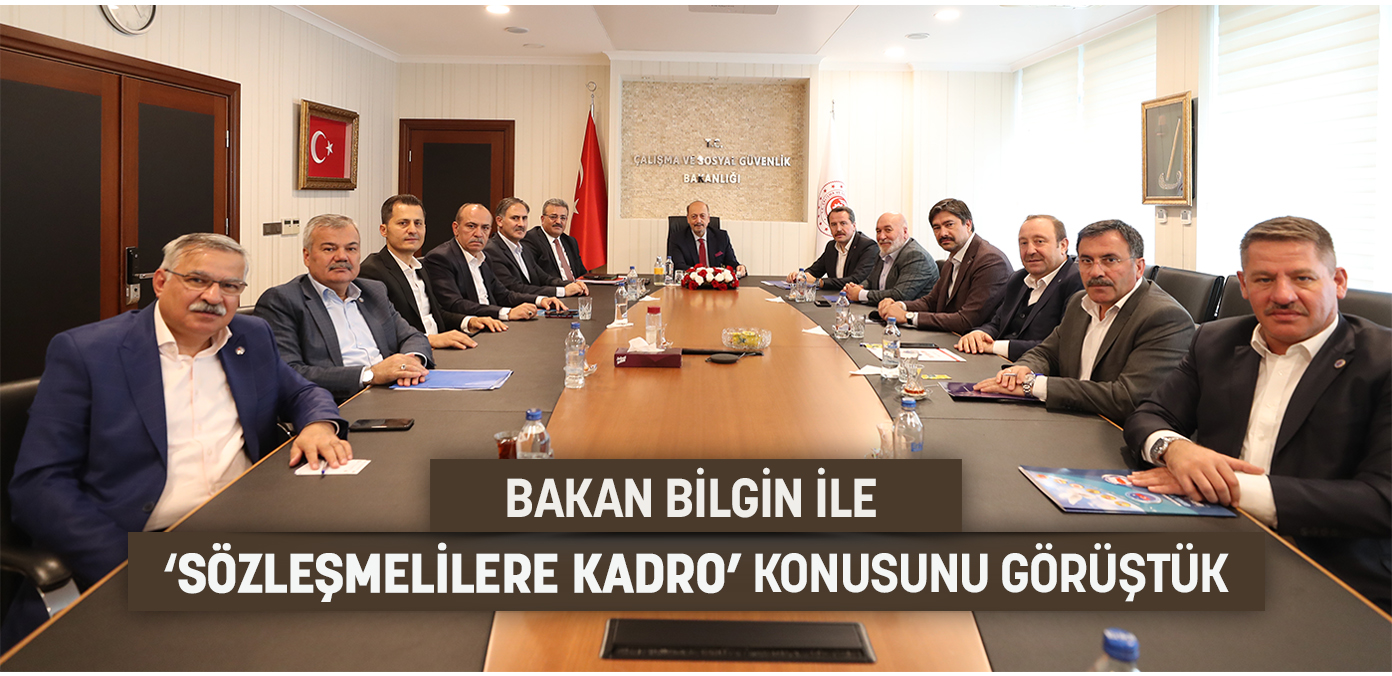 Memur-Sen’in 6. Dönem Toplu Sözleşme’de elde ettiği önemli kazanımlardan biri olan ‘Sözleşmeli Personelin Kadroya Geçirilmesi’ çalışmasında son aşamaya gelinirken, Genel Başkan Ali Yalçın ve 11 hizmet kolunun genel başkanlarından oluşan heyet, Bakan Vedat Bilgin ile görüştü. Yalçın, sözleşmeli kamu personeli ile ilgili düzenlemeye ilişkin devam eden çalışmaların değerlendirildiği toplantıda, sözleşmeli personelin kadroya geçirilmesi sürecinde konfederasyon olarak gerçekleştirdikleri çalıştay, rapor ve toplantılarla sürecin işleyişine başından beri katkıda bulunduklarını ve konunun tarafı olduklarını söyledi.