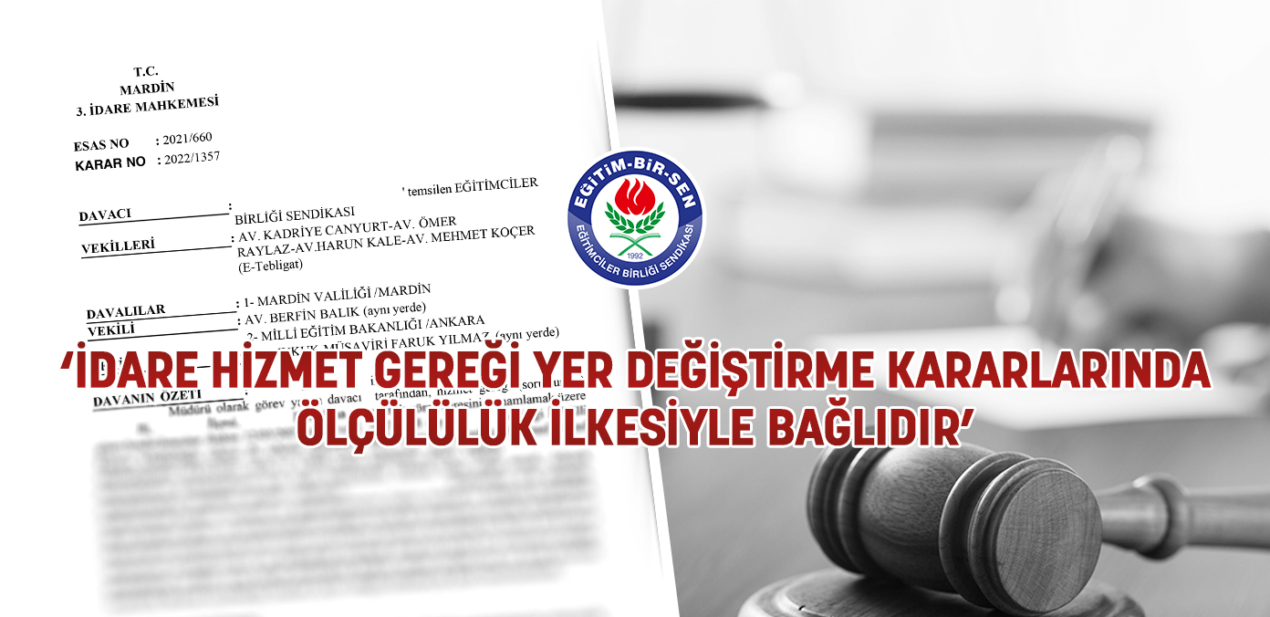Eğitim-Bir-Sen olarak, uyarma cezasının yanında yöneticilik görev süresini tamamlamak üzere bir başka okula isteği dışında ikinci bir cezalandırma niteliğinde görevlendirilen üyemiz adına açtığımız davada, mahkeme, dava konusu işlemi, ölçülülük ilkesinin “orantılılık” ve “gereklilik” alt kriterlerine uyulmadığı, idareye tanınan takdir yetkisinin, ölçülülük ilkesi, hizmet gerekleri ve kamu yararına uygun olarak kullanılmadığı gerekçesiyle iptal etti.