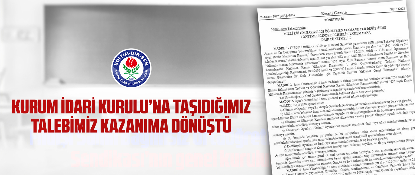 Eğitim-Bir-Sen olarak, Kurum İdari Kurulu gündemine taşıdığımız “652 sayılı KHK’nin geçici 11 nci maddesi hükmü kapsamında atanan öğretmenlerin, 5580 sayılı Özel Öğretim Kurumları Kanunu kapsamında faaliyet gösteren dershaneler ile öğrenci etüt eğitim merkezlerinde öğretmen, uzman öğretici veya diğer unvanlarda geçirdikleri süreler, hizmet puanlarının hesaplanmasına değerlendirilmelidir” talebi Bakanlıkça kabul edilerek yönetmelik değişikliğiyle hayata geçirildi.