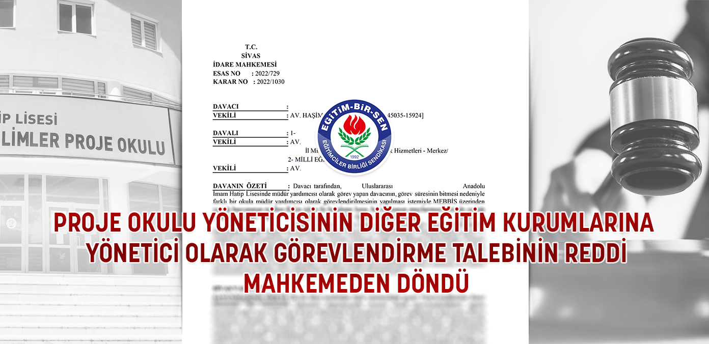 Eğitim-Bir-Sen olarak, proje okulunda olan müdür yardımcısı olan üyemizin, görev süresinin bitmesi üzerine farklı bir okula müdür yardımcısı olarak görevlendirilmesinin yapılması talebiyle yaptığı başvurunun reddine ilişkin işlemin iptali için açtığımız davada, mahkeme, proje okulunda görevlendirilmiş olması nedeniyle üyemize bu hakkın tanınmamasını hukuka aykırı bularak, dava konusu işlemi iptal etti.