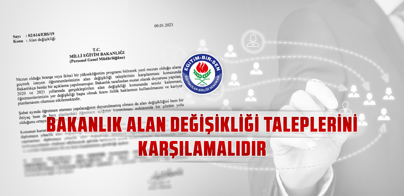 Eğitim-Bir-Sen olarak, Millî Eğitim Bakanlığı’na başvurarak, alan değişikliği konusunda somut adım atılmasını, alan değişikliğinin 2022-2023 eğitim-öğretim yılı ikinci yarıyılı başlamadan evvel sonuçlandırılmasını talep ettik.
