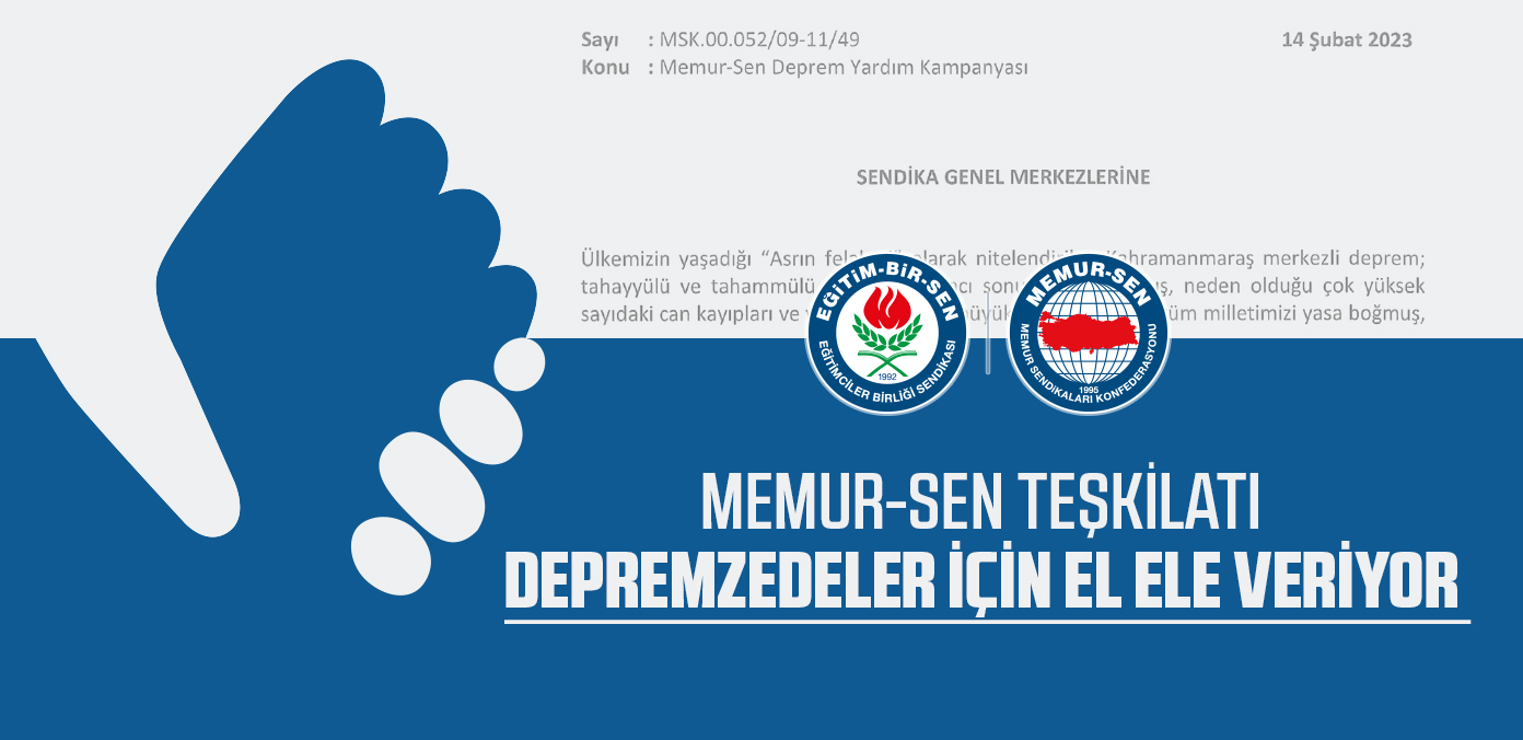 Merkez üssü Kahramanmaraş olan 7,7 ve 7,6 şiddetindeki iki büyük deprem birçok acıyı da beraberinde getirdi. Memur-Sen Arama Kurtarma Ekibi’nin ardından Eğitim-Bir-Sen ve Memur-Sen Genel Başkanı Ali Yalçın ve bağlı sendikaların genel başkanları da deprem bölgelerine giderek arama kurtarma çalışmalarına katıldı. Sorumluluk bilinciyle çalışmalarını sürdüren Memur-Sen teşkilatı, depremin yaşandığı illere yardım TIR’ları gönderdi.