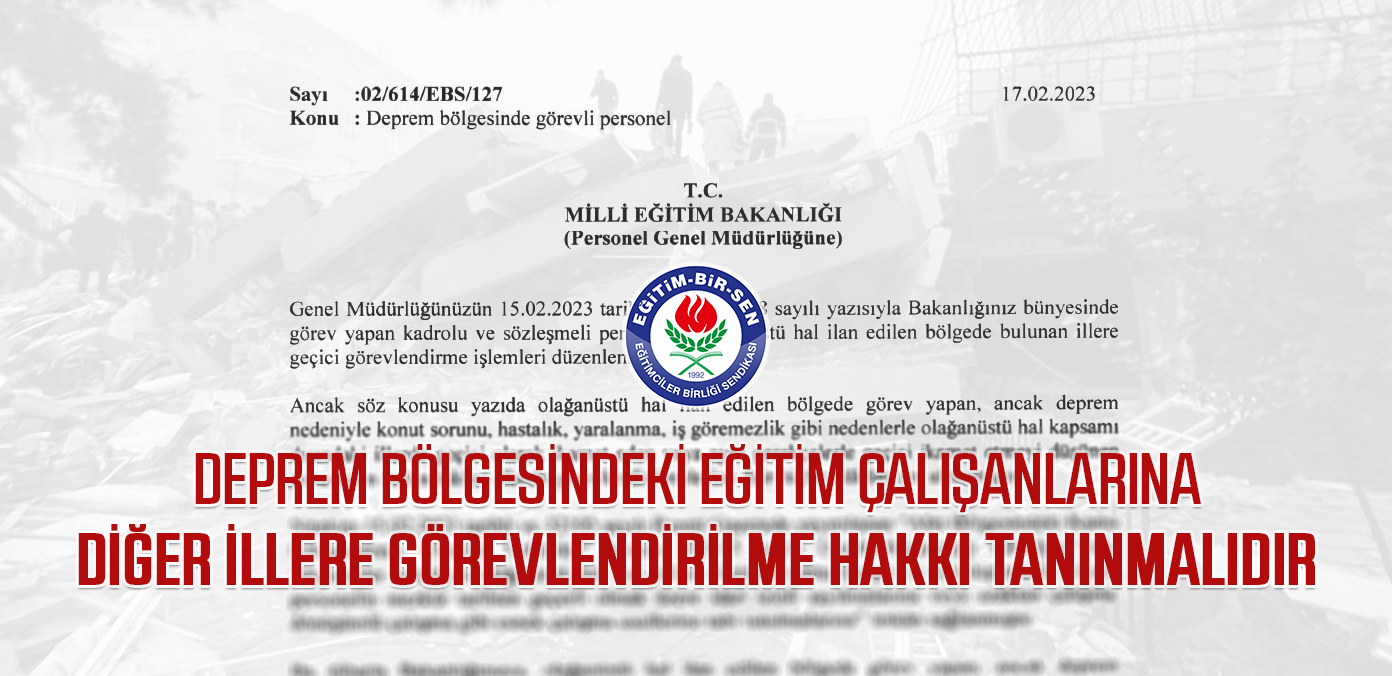 Millî Eğitim Bakanlığı Personel Genel Müdürlüğü’nün 15.02.2023 tarihli ve 70440218 sayılı yazısıyla bakanlık bünyesinde görev yapan kadrolu ve sözleşmeli çalışanların olağanüstü hâl ilan edilen bölgede bulunan illere geçici görevlendirme işlemleri düzenlenmiştir. Söz konusu yazıda, olağanüstü hâl ilan edilen bölgede görev yapan, ancak deprem nedeniyle konut sorunu, hastalık, yaralanma, iş göremezlik gibi nedenlerle olağanüstü hâl kapsamı dışındaki illerde geçici olarak ikamet eden veya aynı gerekçelerle geçici ikamet etmeyi düşünen eğitim çalışanlarının bulundukları illerde görevlendirilmelerine dair hiçbir hüküm yer almamıştır.