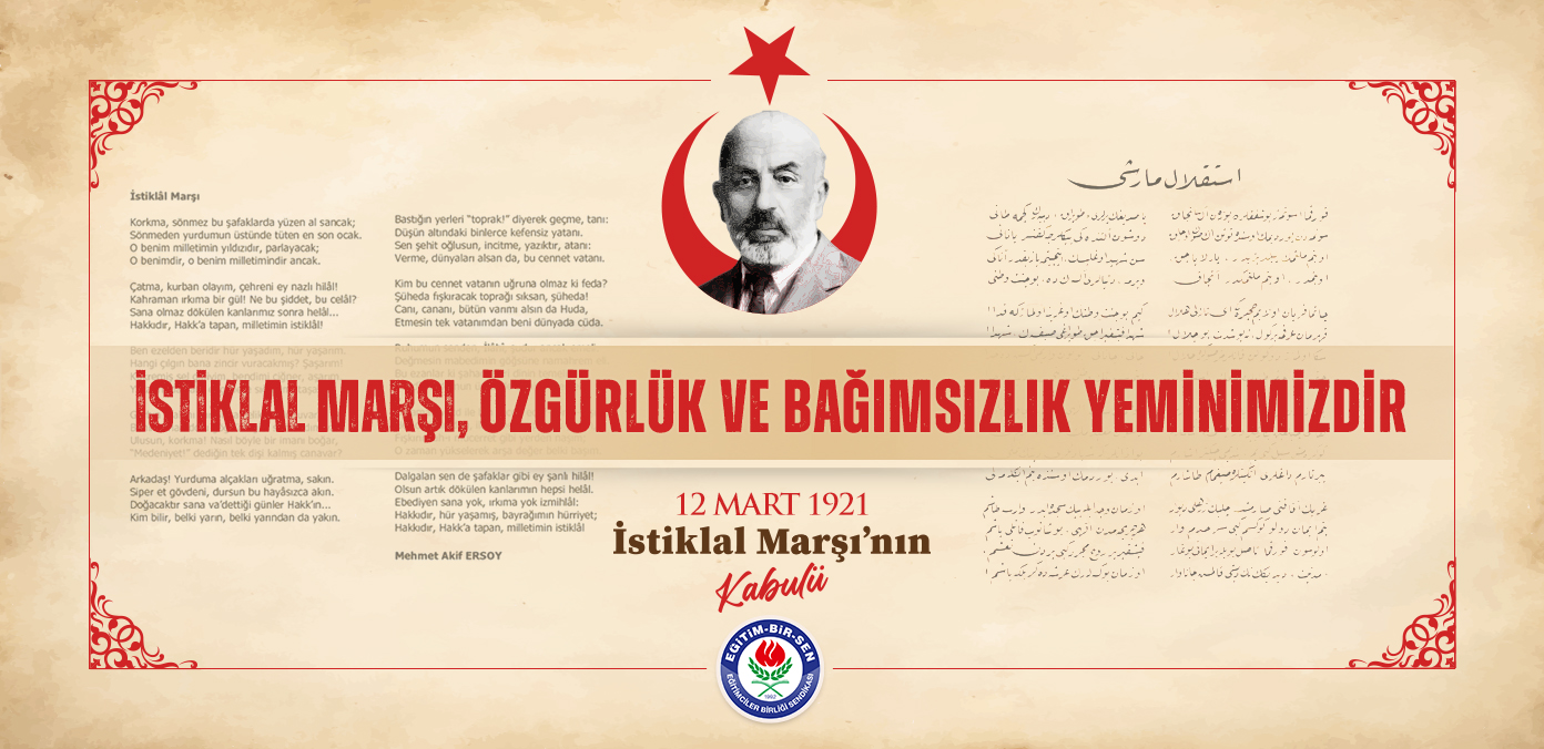 İstiklal Marşı, bizim için sadece törenlerde okunan bir şiir değildir. Eğitim-Bir-Sen olarak, İstiklal Marşı’nın, milletimizin tarihsel bakış ve duruşunu tanımladığı kadar, gelecek kuşakların onur, gurur ve bağımsızlığına da ilham verdiğinin/vereceğinin bilincindeyiz. İstiklal Marşı’nı ve Akif’i iyi anlamalı, istiklal meşalesini bilgiyle, ilimle, eğitimle, erdem ve güzel ahlakla, başarıyla nesilden nesile taşımaya devam etmeliyiz, devam edeceğiz.