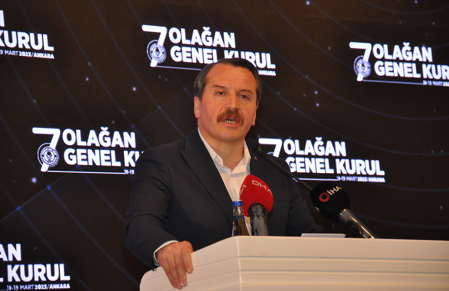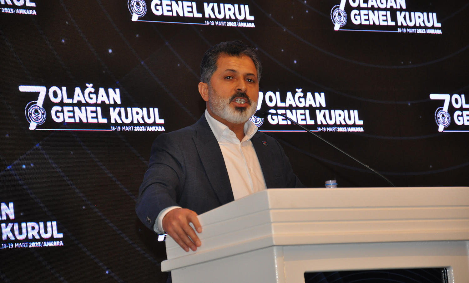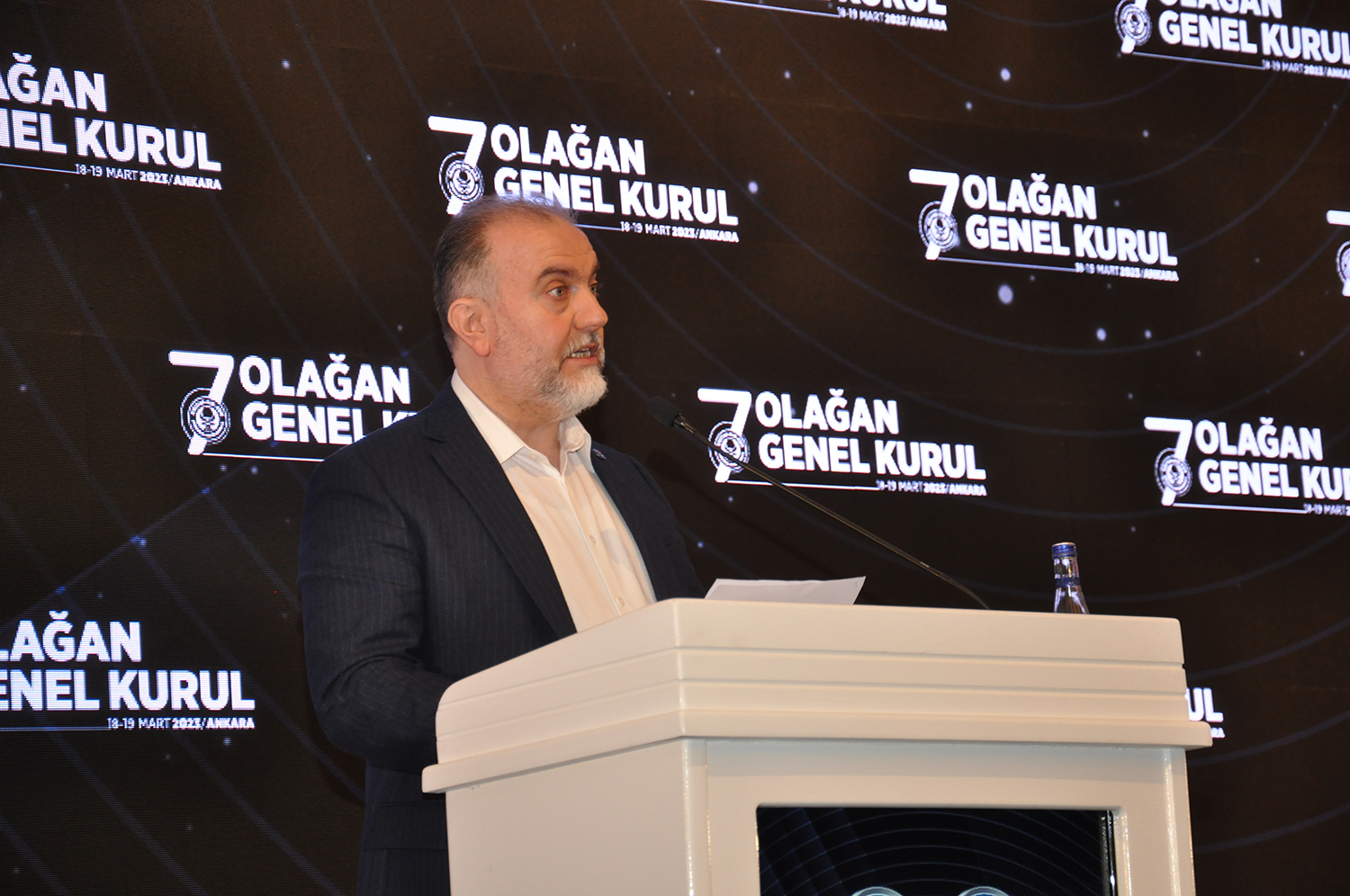Genel kurulun açılışında konuşan Genel Başkan Ali Yalçın, 11 ili etkileyen deprem felaketiyle ülkenin tamamının yüreğinin yangın yerine döndüğünü belirterek, “Rakama sığmaz, havsala almaz bir kıyameti yaşadık. 11 şehrimiz yıkımı gördü, dört şehrimiz deyim yerindeyse toza dönüştü. 15 milyona yakın insanımız sokakta kaldı. Yaklaşık 50 bin insanımızı kaybettik. 100 binin üzerinde yaralımız var. İlk günlerde bölgeye gittiğimde, yıkılan binalar da dik duran babayiğitler de gördüm. Enkazın altında kalan insanlar kadar ayağa kalkan insanlığı gördüm. Cefayı gördüğüm kadar vefayı gördüm, izzetin, onurun destanını yazan onurlu insanları gördüm. Böyle zamanlarda konuşmak kolay değil. Türkiye’nin yükü ağırdır, kemikleri çatırdatır. Evet, ülke olarak gerçekten yükümüz ağır. Onun için, omuzlarımız çökmemelidir. Acıyı, kederi yüklenip, birbirimize tutunup, dayanışmayla yerde kalanı kaldırmalıyız” dedi.