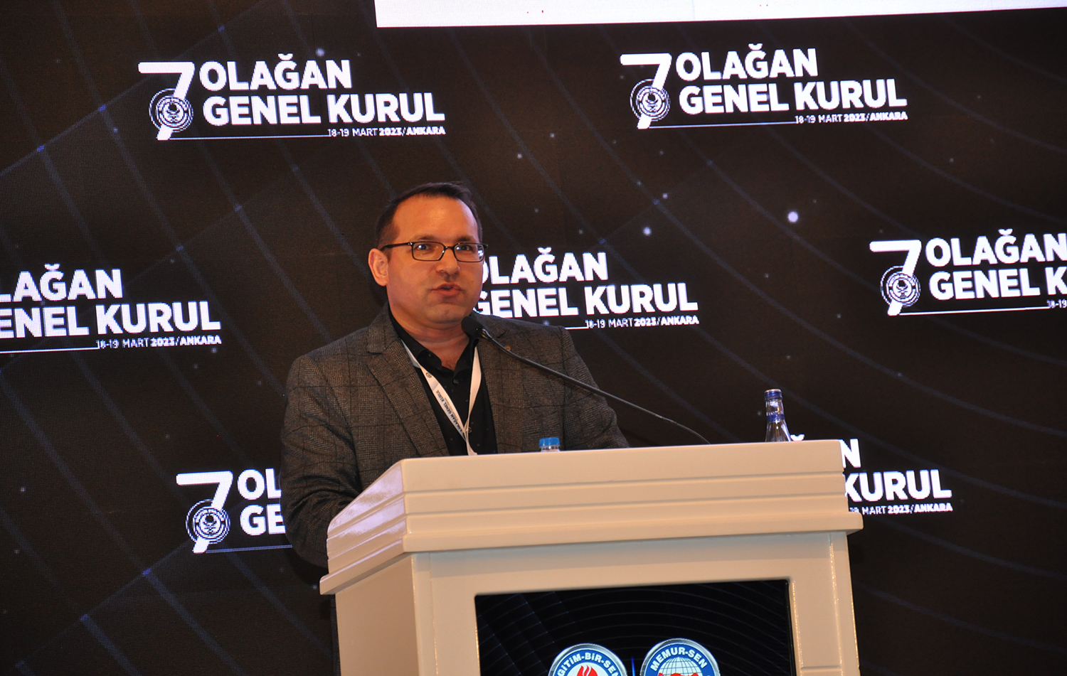 “Krizler çağındayız” diyerek konuşmasını sürdüren Yalçın, “Dünyanın dört bir yanında depremler, afetler, felaketler yaşandı, yaşanıyor. Bir yandan da emperyalist emellerin kışkırttığı çatışmalar sürüyor, bölgemiz yangın yeri. Emperyalist metropollerde yeni yeni stratejiler geliştiriliyor. İçeride bunun yansımalarını hep birlikte görüyoruz. Teröristler ve onun uzantıları tetikte. İşte biz bu ‘adi’ düzene karşı ‘adil’ bir düzeni savunuyoruz. Ülkemizde millî gelirin adil dağıtılması, dünyada gelir dağılımında adaletin sağlanması için çalışıyoruz. Sadece ve sadece özlük haklarıyla, salt ücret sendikacılığıyla yetinmiyoruz. Üyelerimizin, eğitim çalışanlarının, kamu görevlilerinin haklarını savunurken; üyeye, ülkeye, yerküreye hizmet sendikacılığı şiarıyla hareket ediyoruz” ifadelerini kullandı.