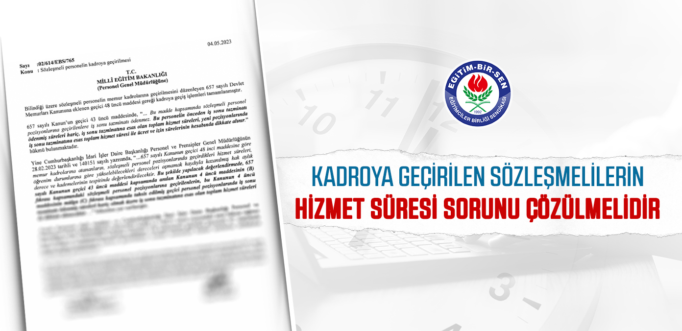 Eğitim-Bir-Sen olarak, Millî Eğitim Bakanlığı’na başvurarak kadroya geçirilen sözleşmeli personelin daha önce 4/C statüsünde geçirilen sürelerinin kazanılmış hak aylık derece ve kademesinde değerlendirilmesi eksikliğinin giderilmesi yönünde taşra teşkilatına genel bir yazının gönderilmesini talep ettik.