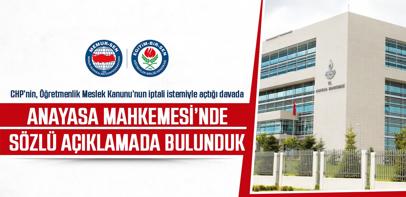 Eğitim-Bir-Sen Genel Sekreteri Talat Yavuz, Öğretmenlik Meslek Kanunu’nun (ÖMK) bazı maddelerinin iptali istemine ilişkin açılan davada, Anayasa Mahkemesi’nde sendikamız adına sözlü açıklama yaptı. Yavuz, 7354 sayılı Kanun’da öğretmenlik kariyer basamaklarının ismen tanımlandığını, uzman öğretmenlik ve başöğretmenlik unvanına sahip olabilmek için aranan şartların sayıldığını, bunun ötesinde kariyer basamakları sürecinde öğretmenlerin basamak unvanlarındaki görev ve yetkileri, çalışma şartları, yetkinlik unsurları, bu doğrultuda mesleki gelişim kavramı, mesleki gelişim unsurları, mesleki çalışmaların neyi kapsadığı, mesleki çalışma olarak addedilecek veya addedilmeyecek çalışmaların ayrımında kullanılacak kıstaslar, mesleki eğitim programlarının içerik, amaç ve hedefleri ile bunların yetkinliğini ölçmeye yarayacak başarı kriterleri vb. hususların kanunda düzenlenmediğini ifade ederek, “Bu itibarla ilgili hüküm, kanunilik ilkesine ve Anayasa’nın 128. maddesine aykırılık teşkil edecektir” dedi.
