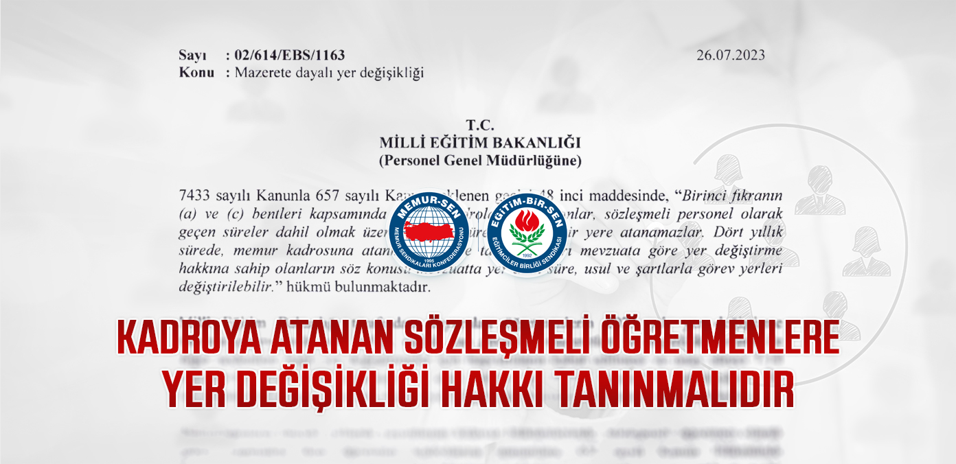 Eğitim-Bir-Sen olarak Millî Eğitim Bakanlığı’na başvuruda bulunarak, sözleşmeli iken kadroya atanan öğretmenlerin, üç yıllık hizmet süresini tamamlama şartı aranmaksızın mazerete dayalı yer değişikliği hakkından faydalandırılmalarını talep ettik.