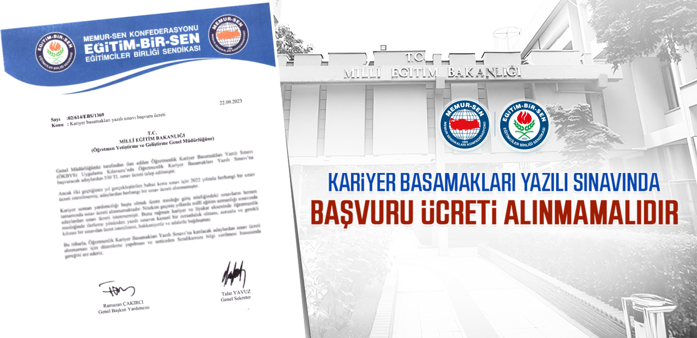 Eğitim-Bir-Sen olarak Millî Eğitim Bakanlığı’na başvuruda bulunarak, Öğretmenlik Kariyer Basamakları Yazılı Sınavı’na katılacak adaylardan sınav ücreti alınmamasını talep ettik.