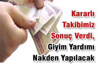 Ayni yardim seklinde gerçek- lestirilen ve kamu görevlilerinin bir bölümünün yararlanmakta oldugu giyim yardiminin nakden ödenmesi konusunda verdigimiz kararli ve uzun soluklu mücadele sonuç verdi.
